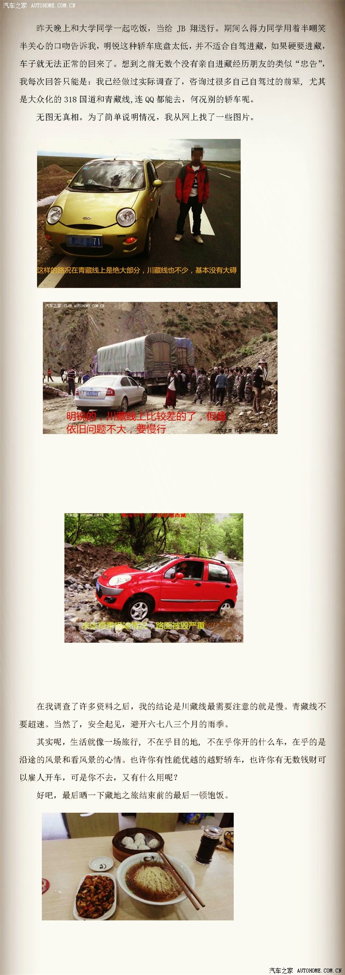 看着地上,我已经准备好的东西,看着那一包包玉米片和牛奶,看着我已经准备好给西藏小朋友带去的巧克力,看着我为了应付冰冻买的防滑链……我在想,此次自驾进藏,前方也许还有许多许多困难,但我相信我自己可以克服的。为了老去的时候,不后悔今天,我依然坚定的前行。起码和你们相比,我倍感自豪。