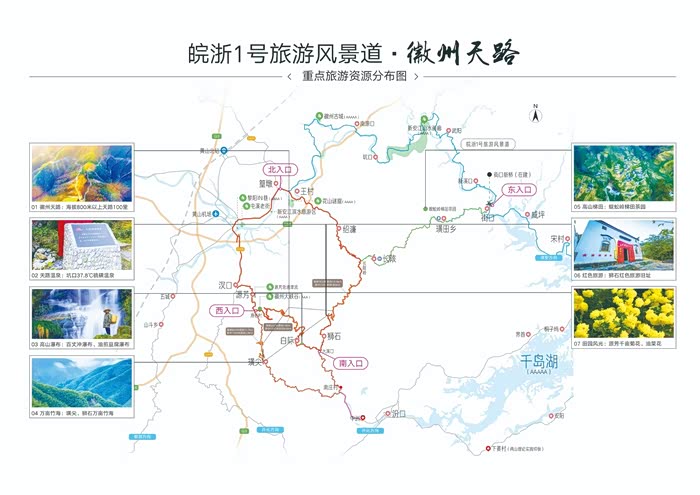 “徽州天路”位于黄山市东南部,跨屯溪区、歙县、休宁县下属8个乡镇,由璜尖天路、白际天路和狮石公路3个部分组成,是被誉为“中国东部自驾游天堂”的皖浙1号旅游风景道的重要组成部分。目前自驾游线路主要包括1条大环线和3条支线,大环线里程约108公里,车程4小时,其中海拔800以上路段超过50公里,1000米以上路段约20公里,堪称“天空上的一条彩带”。