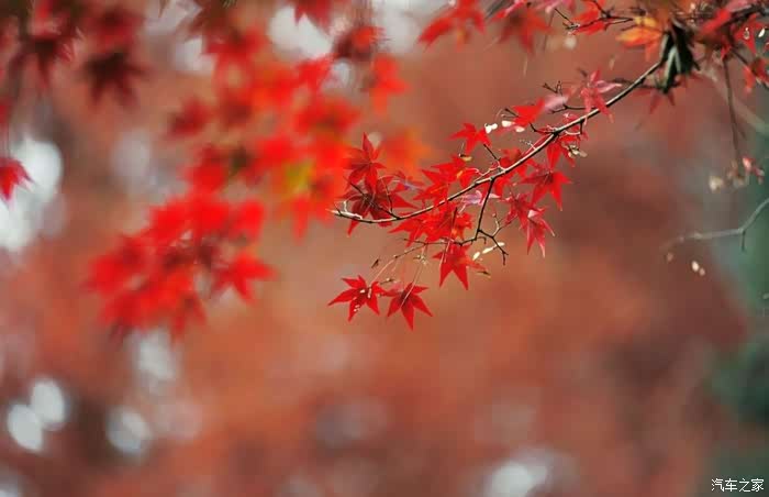 秋叶红艳,灿若朝霞,掌状叶裂片有似羽毛,有似线条。