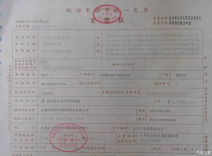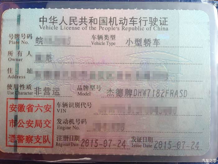 也对不住朋友了……回去之后越想越气,看高7去,老婆给以前同事打电话,哈哈,有优惠了,14500,和杰德价格差不多,但配置高了不少啊,不说了,定去!可又万万没想到的是,我要的1.6自舒金色没有,要等十来天,煎熬啊……可过了两个十来天,还是没有。老婆说,去合肥买吧,可这时的我,发现心里还是放不下杰德,放不下他那宽敞的空间,放不下爸妈那欣喜的眼神。好吧,说服老婆,咱杀回去,旧车同样33000卖给了一个朋友,给她老婆上下班代步用的,新车老爸说舒适版不好,加了预算上了精英版,好了,这才终于把你接回了家。