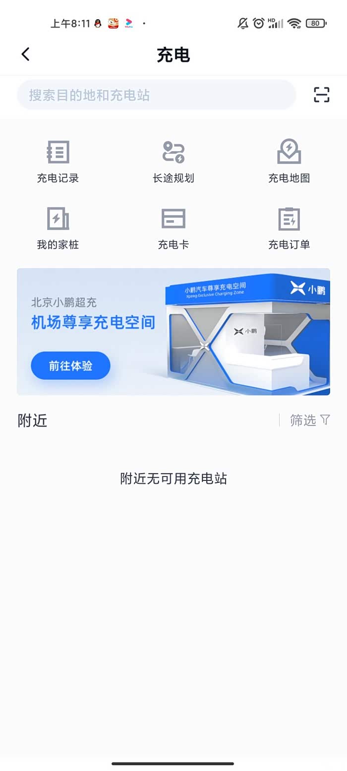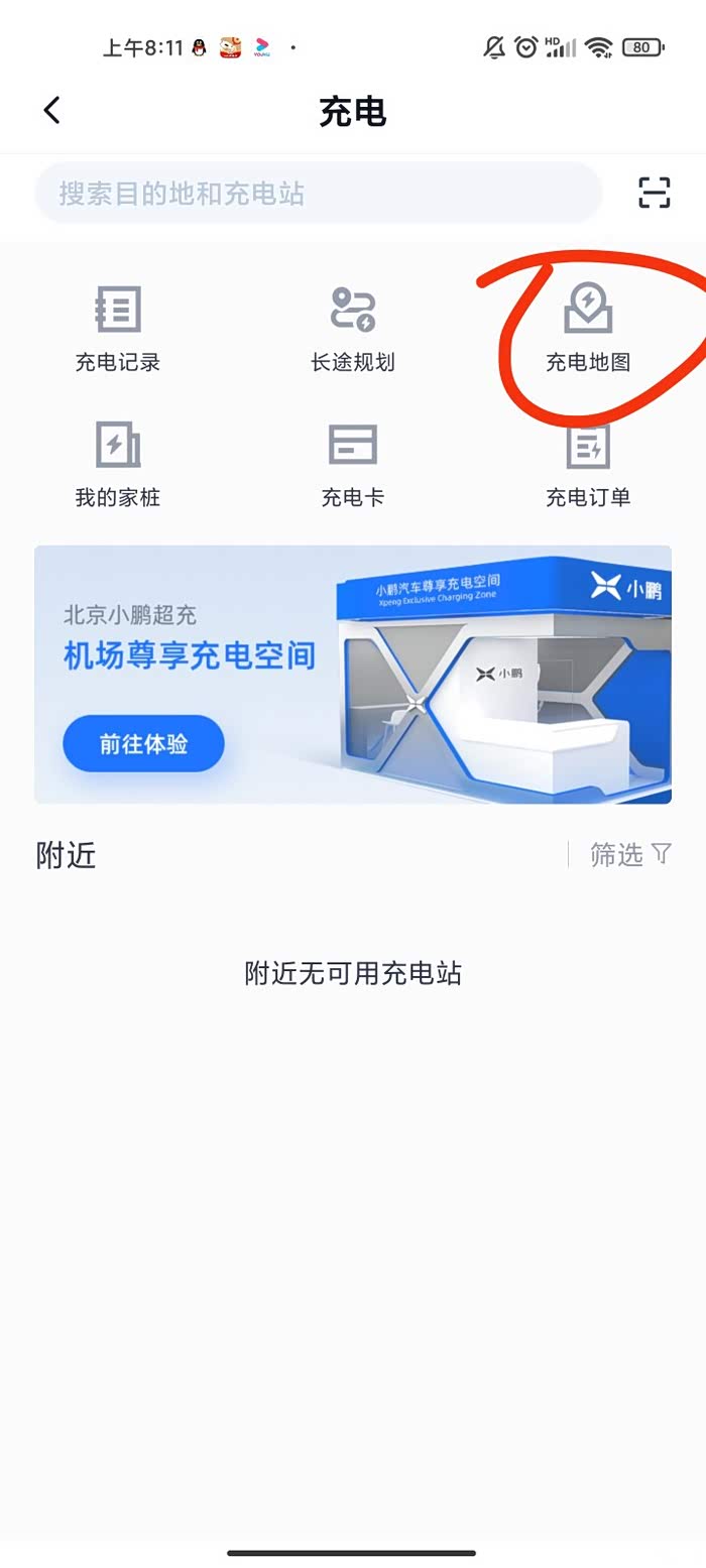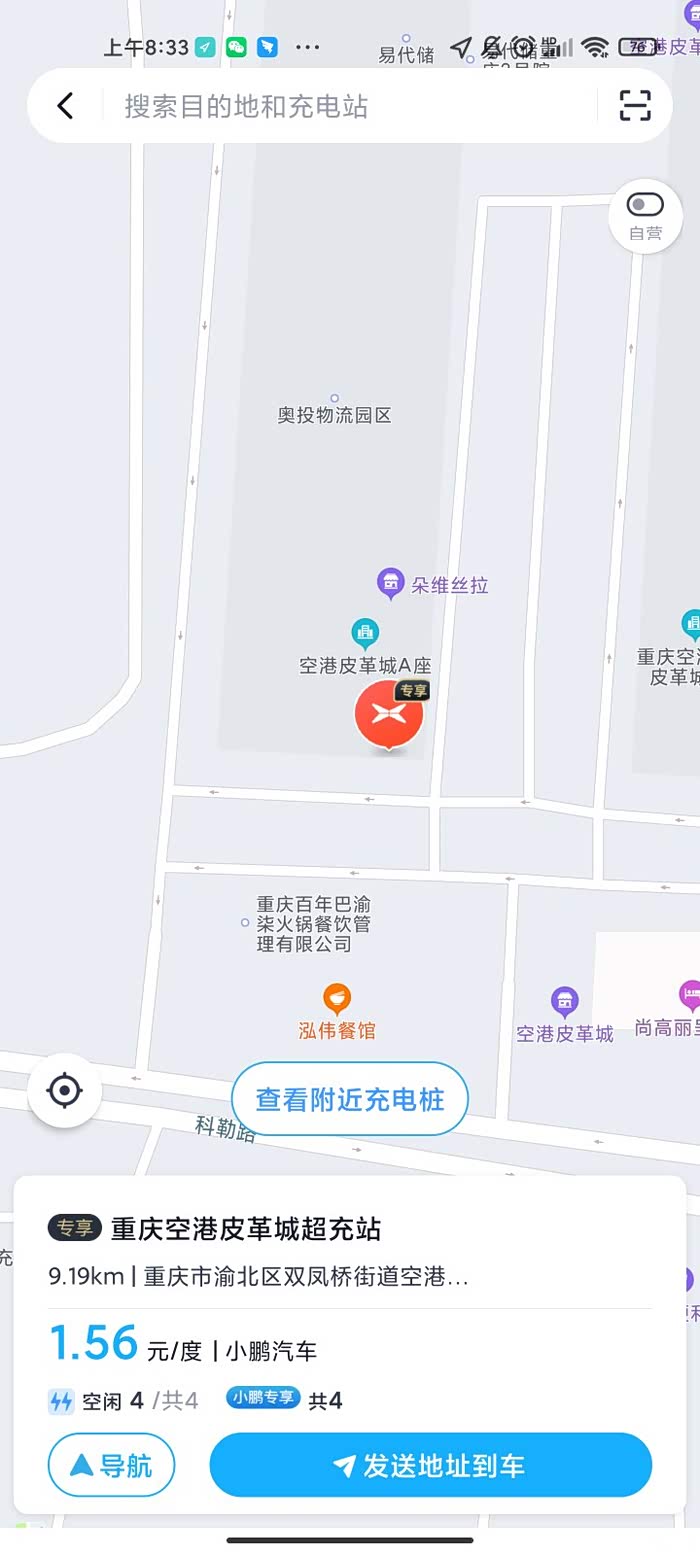进入到这个页面,显示你附近的充电站,一般有两种。一种是带小鹏标的,就是免费的充电站,一种就是一个电的标志就是普通的充电站显示合作(其实就是自费的充电站)。