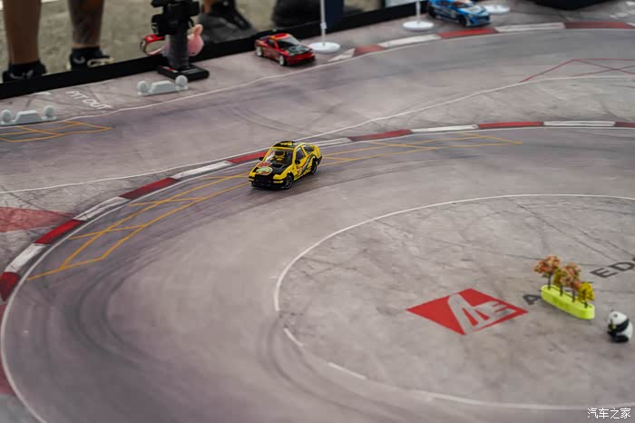 这个展位最有意思!旁边在举行D1漂移比赛的正赛,引擎的轰鸣加上轮胎撕裂地面的声音在耳边环绕,这边你可以开着遥控车在小赛道上进行漂移,这种联动真是有点意思!