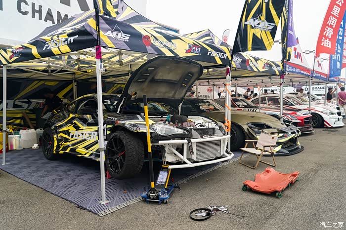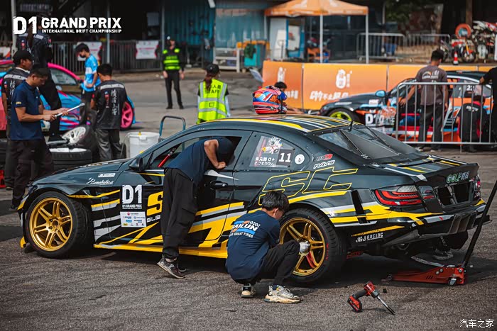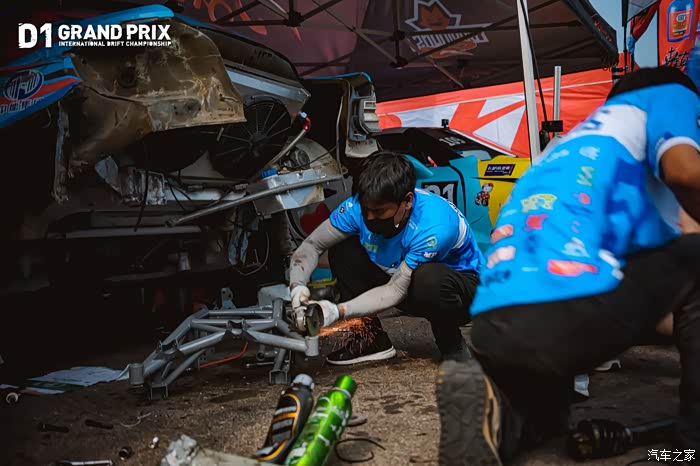 不过还有一句话叫:好车手都是撞出来的,不管是漂移赛,还是直线加速赛、圈速比赛,每次都能看到撞车的情况发生。这次D1漂移大奖赛最惨的应该就是这台M2了,第一天比赛的时候因为动作幅度过大,整个左侧车尾拍在了墙上,整个后翼子板、后桥、避震等等全部变形。叉车叉出来后技师团队在P房直接现场抢修,能换的配件直接换新的,最后用大力胶粘好后保险杠,齐活儿!结果在第二天的双车追走中,这台M2在跟漂过程中骑在了领漂的E46身上,目测避震和拉杆是废了~