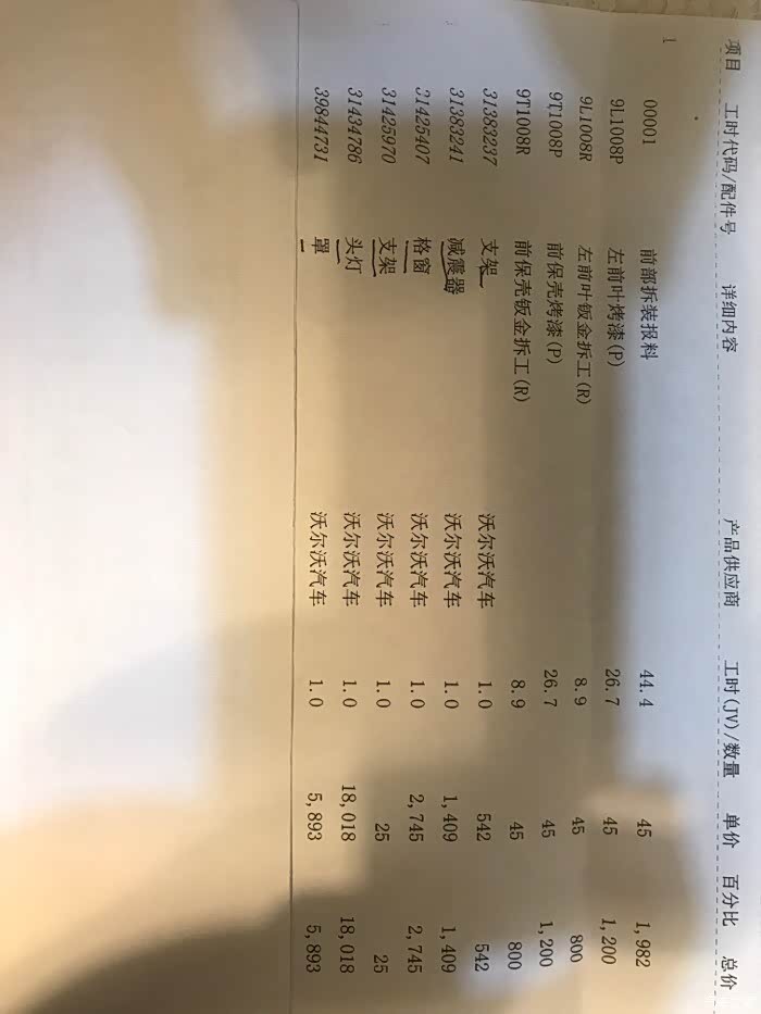 说一两千的,做梦呢,料5893.喷漆1200.拆800.那些支架,减震器(非底盘减震器)不确定你是否更换,没8000到一万下不来的,中网2745。我也就一个小追尾,三万多。一个大灯一万八,靠,十对大灯换一辆车了。