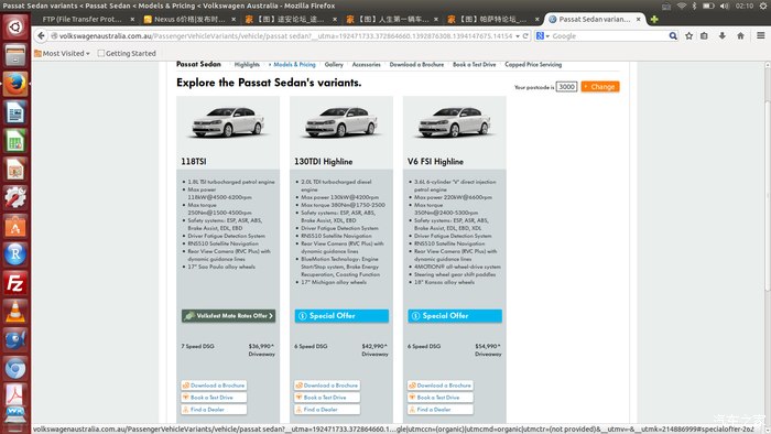 选车过程其实很简单,在网上浏览自己想要的车,如果不是全新车的话再花钱在网上买一份该车的事故记录报告(数据源自政府,比较可靠,而且是合法的),最后起dealer那验车(其实就是最后确认是否喜欢这辆车。一般质量啥的都没问题)。 在中秋节前一天,我的钱终于到位了,可是我喜欢的车被卖掉了,最后交了500刀,打算买一辆a4(你没看错,不带l,后排空间非常感人)。之后还是不甘心,在网上看车,终于见到了我的那个她- passat 2.0tdi。 我看到她的数据,还有价格,就立马知道了这就是我想要的车! 2014年2月生产,5月上牌,开了9000公里,连首保都没到,还带天窗,只要36000澳币。要知道,这边的同款展示车一般都要4万,还不带天窗。顺带说一句,这边的车一般都是按排量算价格,高配(highline)就是排量大的,天窗什么的都是选配,包括真皮座椅啥的(这点passat很厚道,全系标配真皮,这点在澳洲已经算是很少的了,不像国内)。于是第二天一早就租车,直奔dealer。