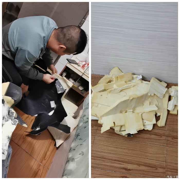 ?我哥上夜班,提前叫他起床来帮我弄这个泡沫,这个泡沫是主副驾驶地板,如果不要这个泡沫,那装车后,地板就不平整了,泡沫背面粘贴的就是隔音板胶,贴得牢牢的,又臭也要取下来