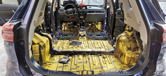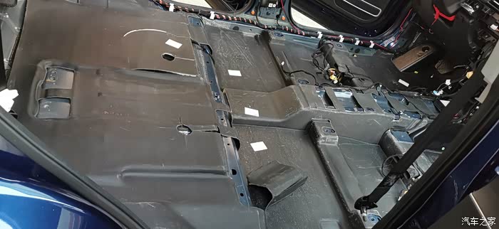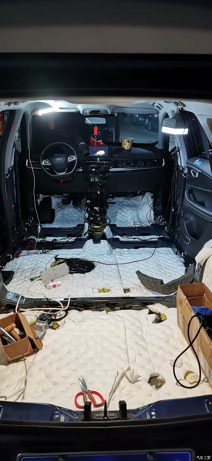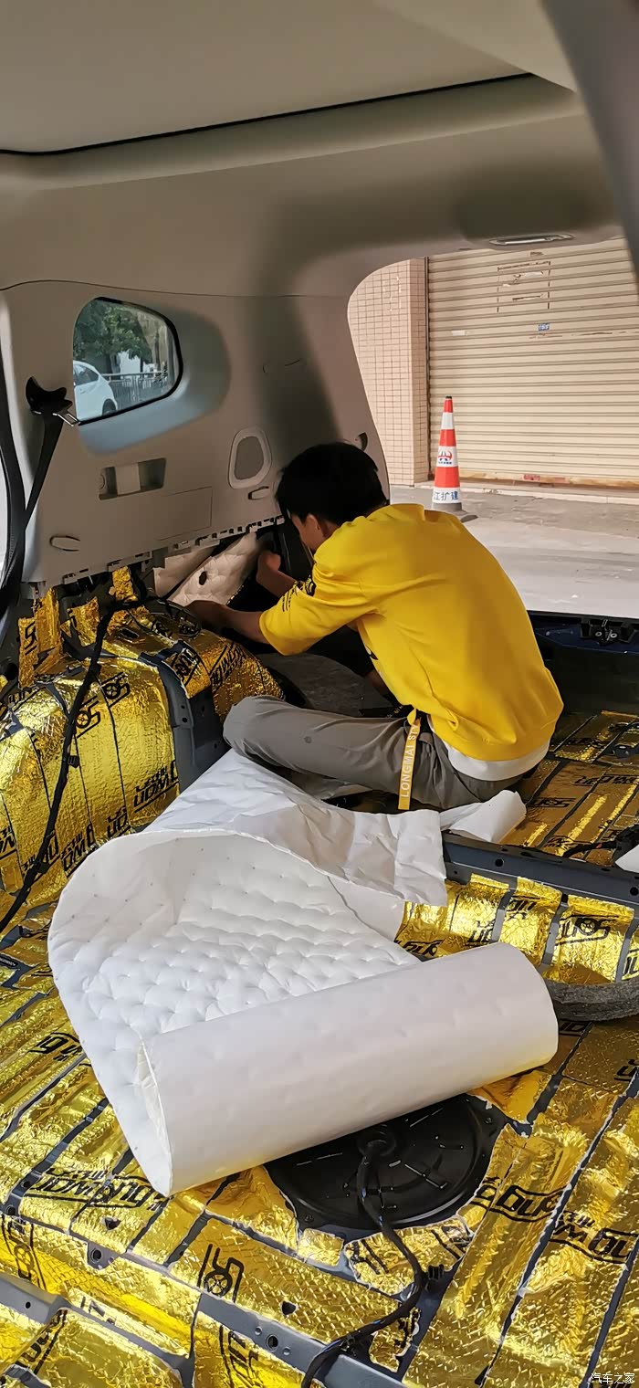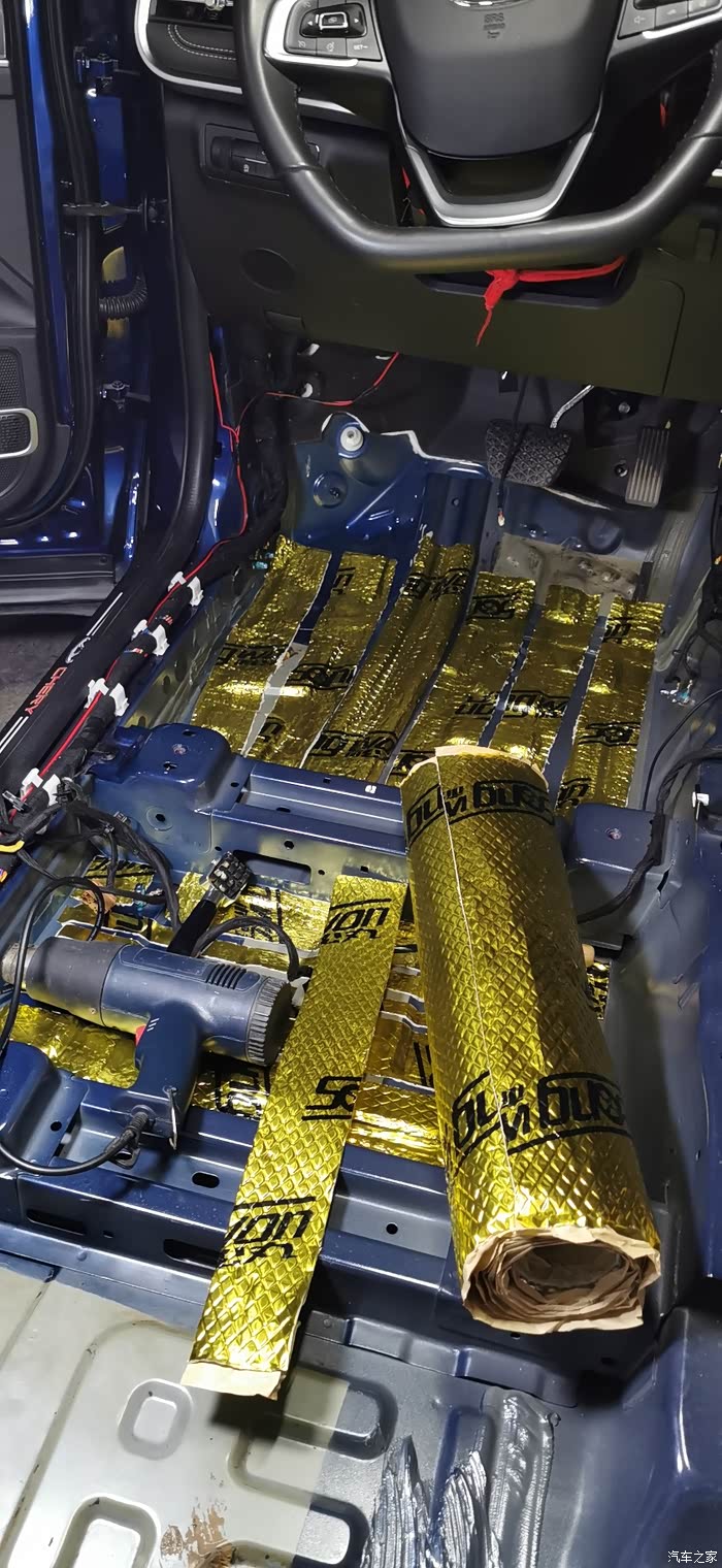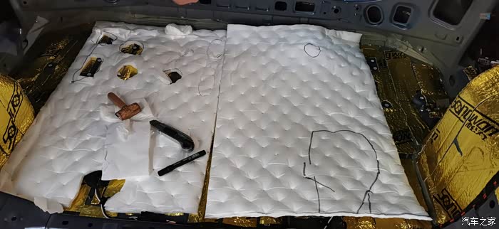 ?7点上楼吃饭,吃完继续,贴隔音棉就简单了,又快,剪好尺寸一整张铺上去,当然也要开好孔,车底盘也有很多螺丝孔,一定要画好线剪出来,不然到时装车装不了