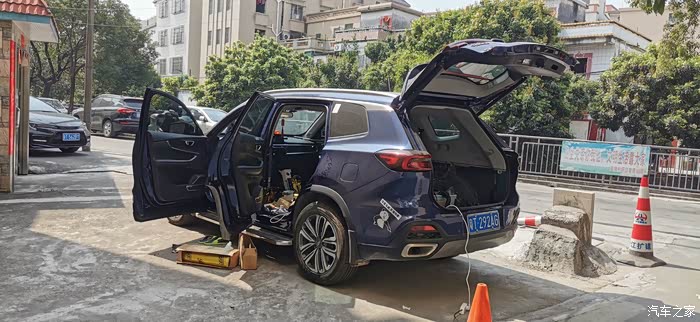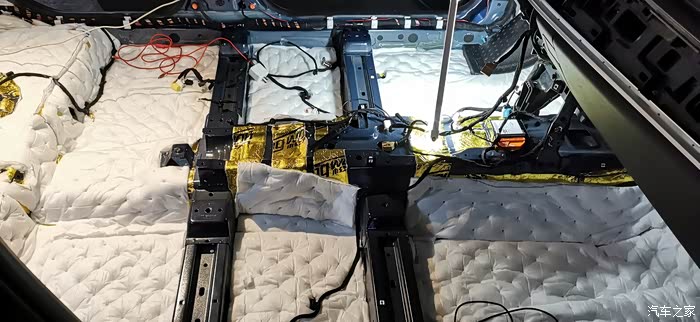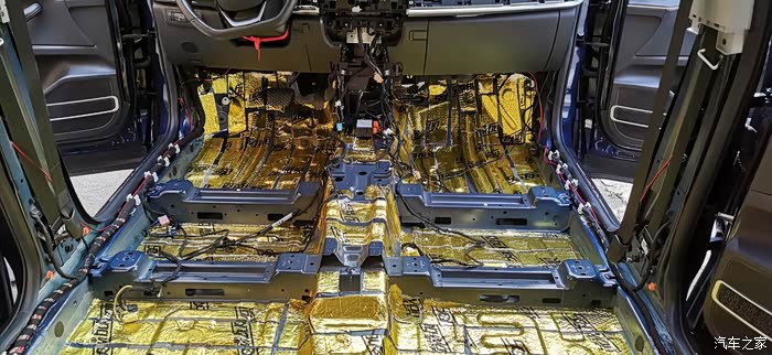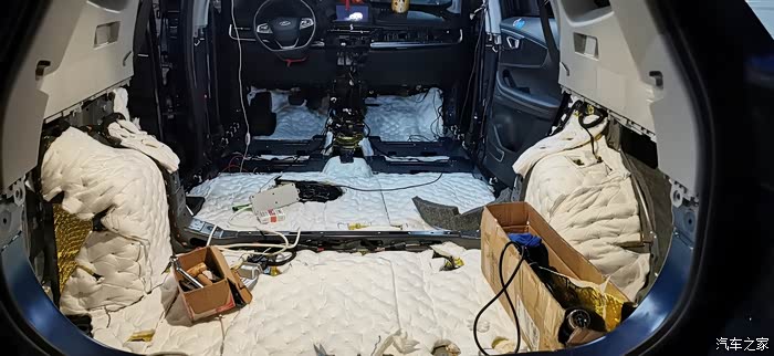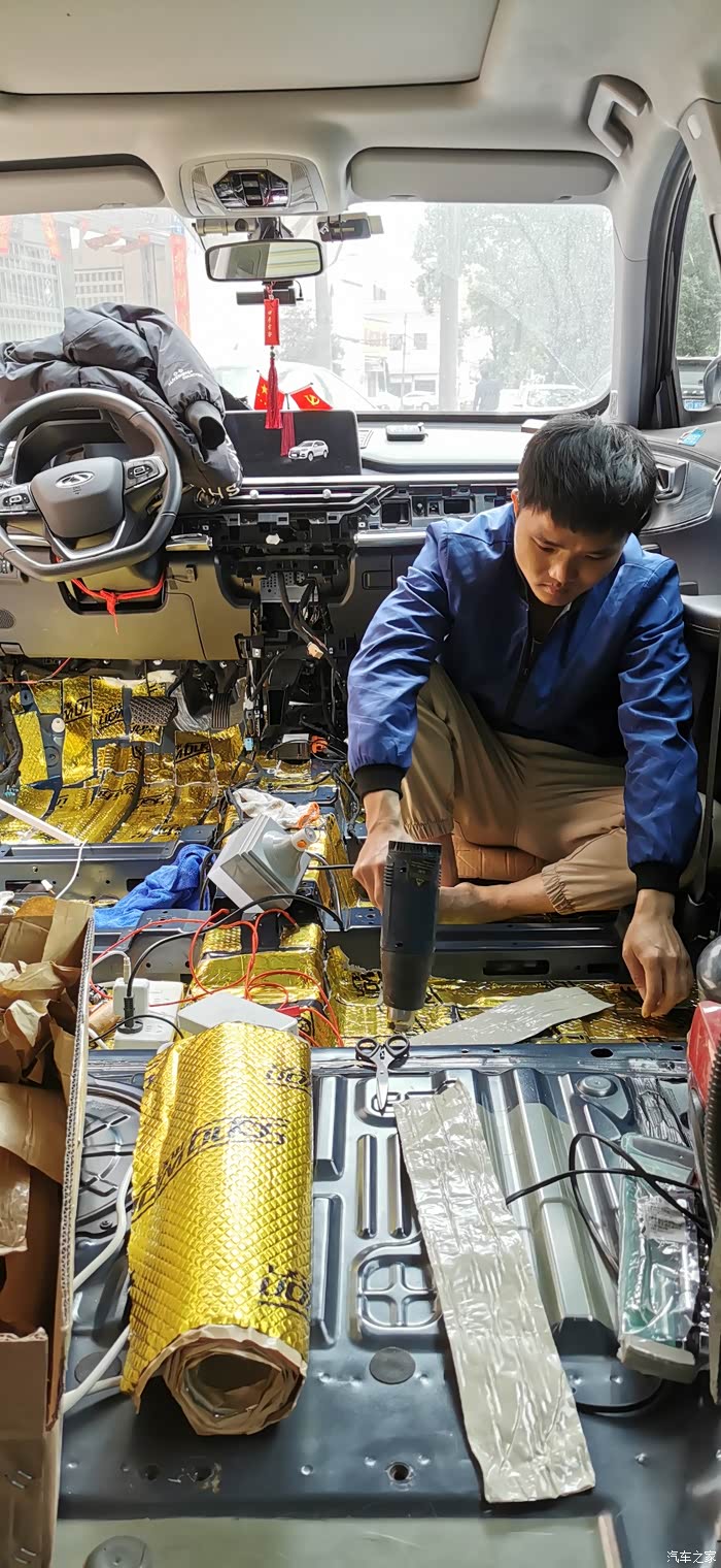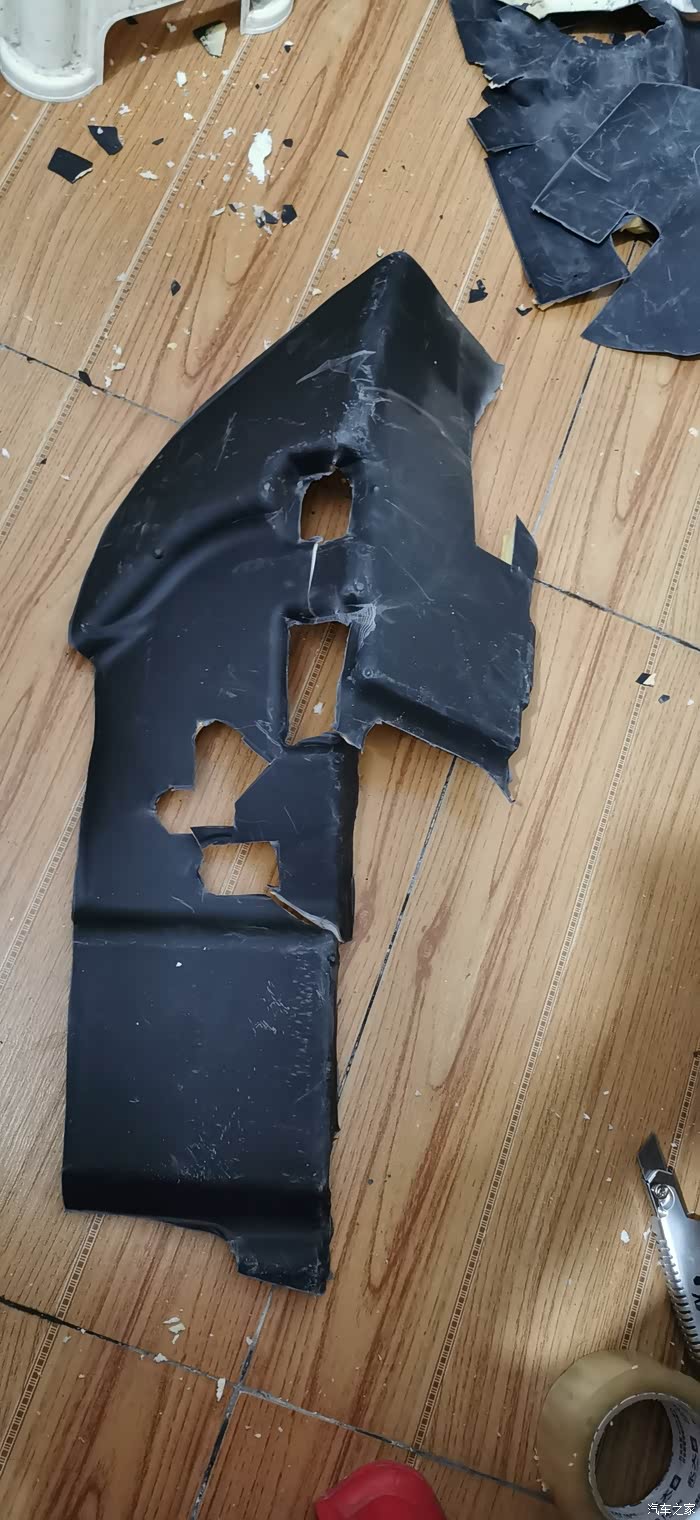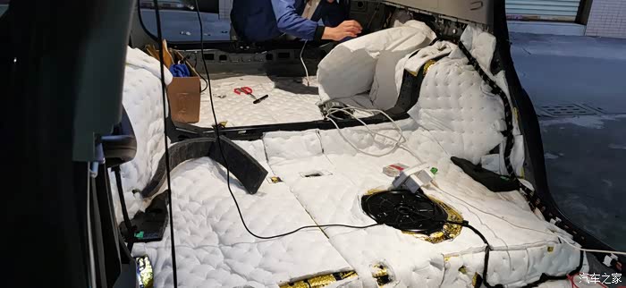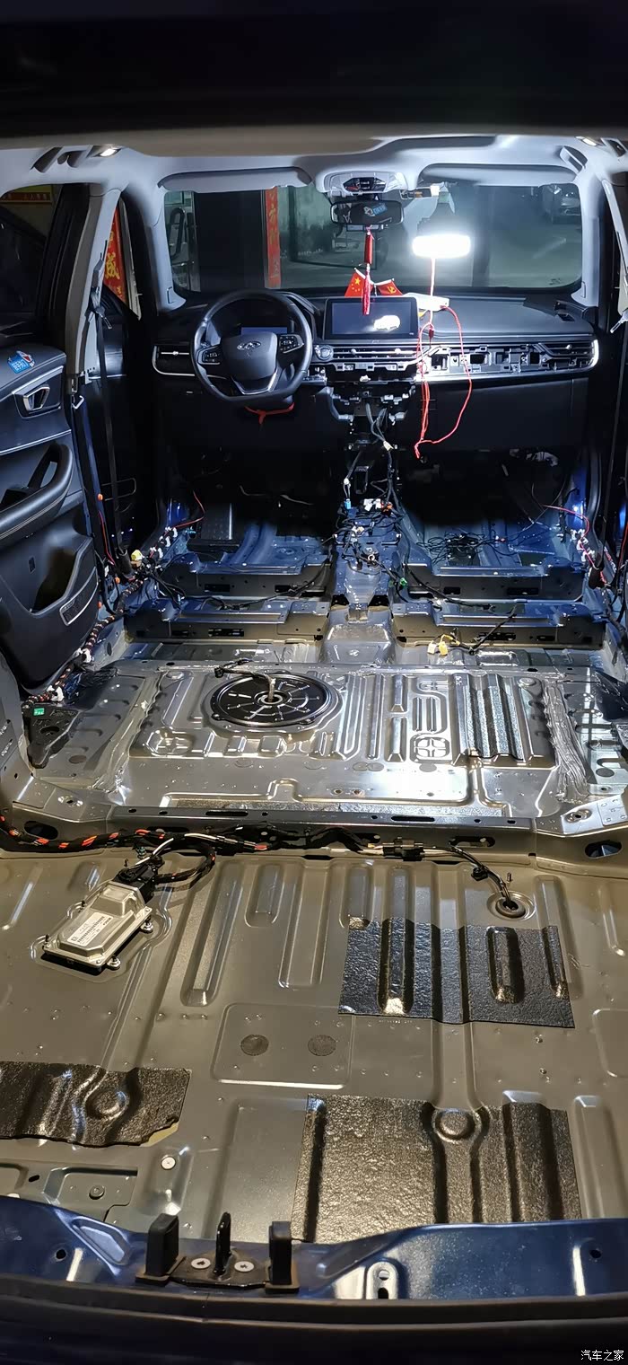 ?7点上楼吃饭,吃完继续,贴隔音棉就简单了,又快,剪好尺寸一整张铺上去,当然也要开好孔,车底盘也有很多螺丝孔,一定要画好线剪出来,不然到时装车装不了