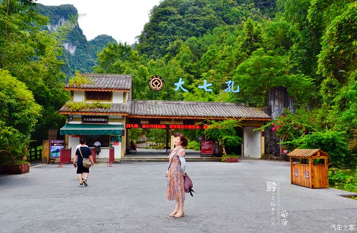大七孔,景区文字介绍:“是以原始森林、峡谷、伏流、地下湖为主体的景区,距小七孔鸳鸯湖景区约5公里。景观峻险神奇、气势雄峻磅礴,山高谷深,水流湍急,洞中有瀑,瀑下有湖,湖上有天窗,阳光投下形如日月星斗,还有一座高80余米的天生桥巍然而立,被专家们誉为‘大自然神力所塑造的东方凯旋门’,观之令人肃然起敬。”