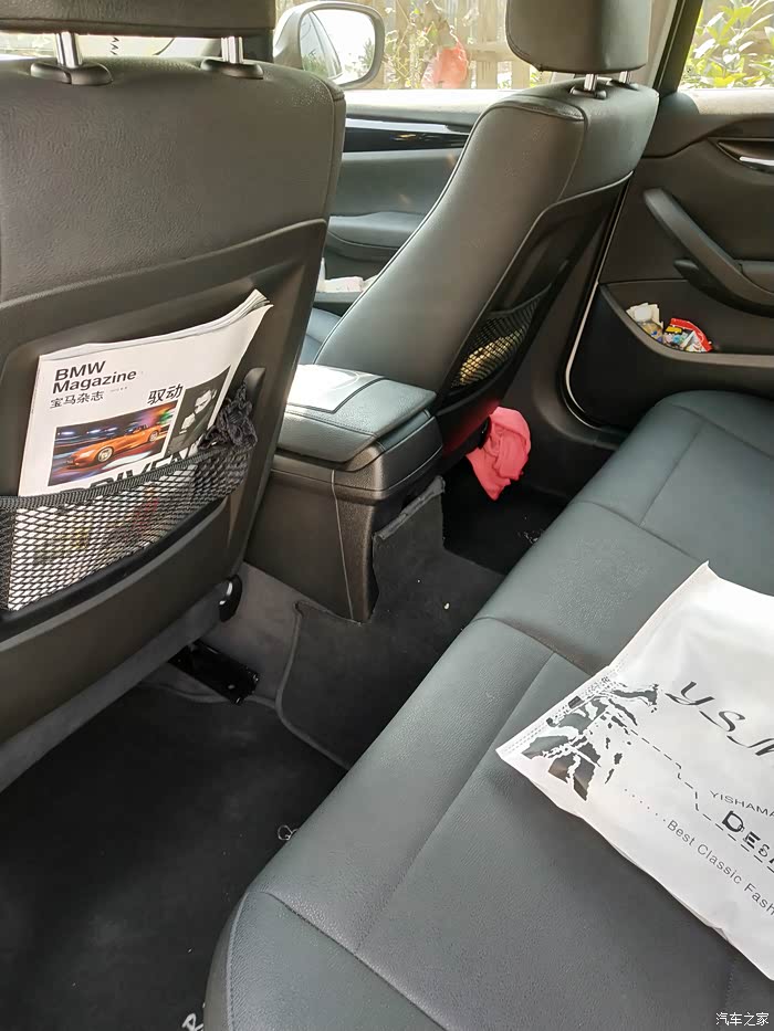 一代经典的X1内部空间其实够用,也还是很宽的,因为后驱有个传动轴,所以后排中间有个凸起,不过凸起还可以,男人都容易凸起嘛,凸起后妹子才喜欢!!!后背的这本杂志记得是6年前买车时在4S店拿的。亲戚朋友做后排无聊时看看宝马杂志。忘了补充:老款的X1后排可以随意放倒和放平,和床一样的感觉,***很方便。。自驾游时后排直接可以当床休息。