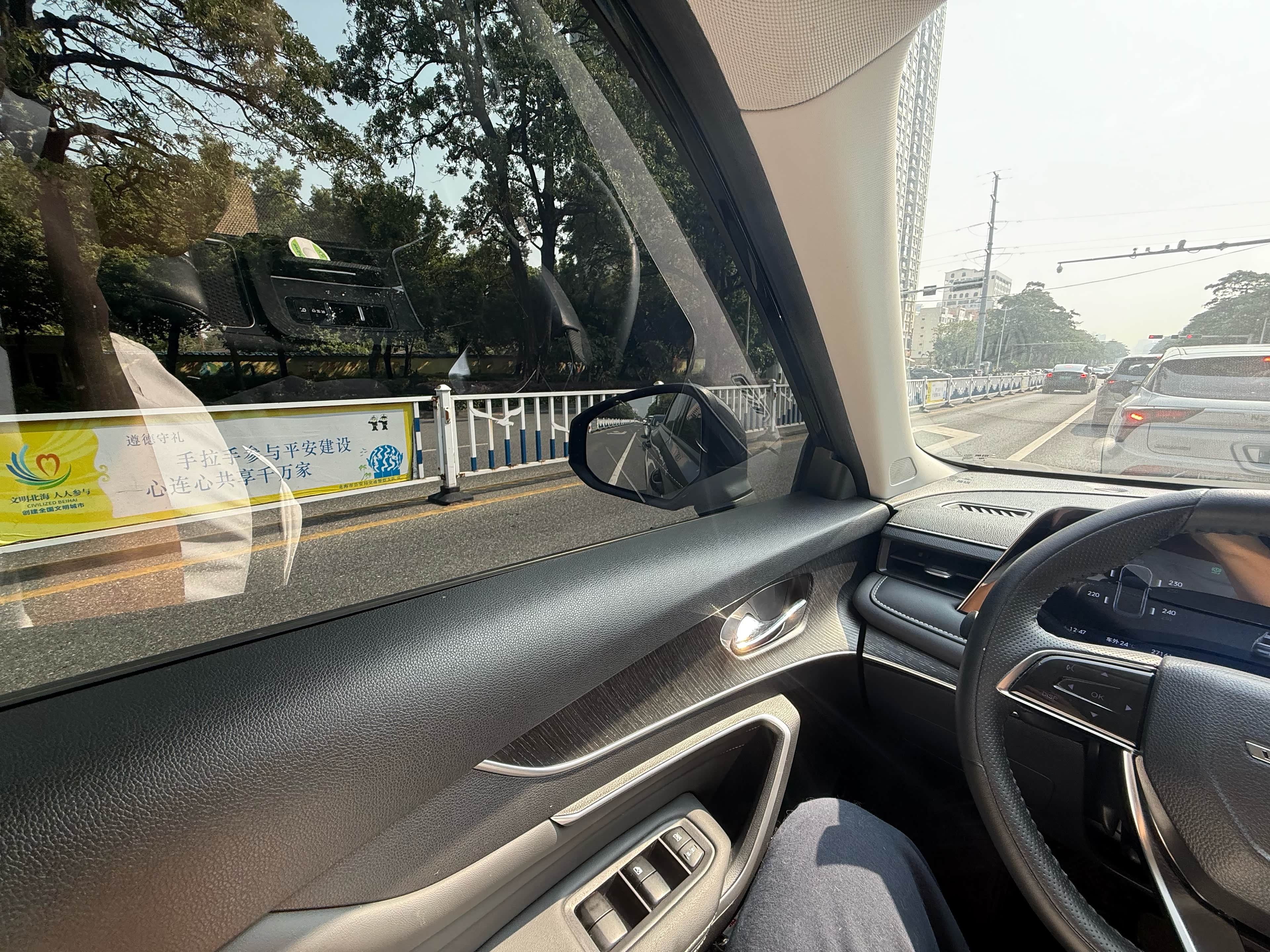 当天市区气温26℃,微风不燥,特别适合出行。早高峰刚过,市区主干道车流不算密集,偶尔遇到几个红绿灯路口,通行很顺畅;转入城郊公路后,路面变得开阔,两侧是成片的绿树和农田,空气比市区清新不少,只是部分路段有零星坑洼。一路下来,不管是市区的平缓路面,还是城郊的轻微颠簸路段,整体路况都在可控范围内,没有遇到拥堵或极端路况。