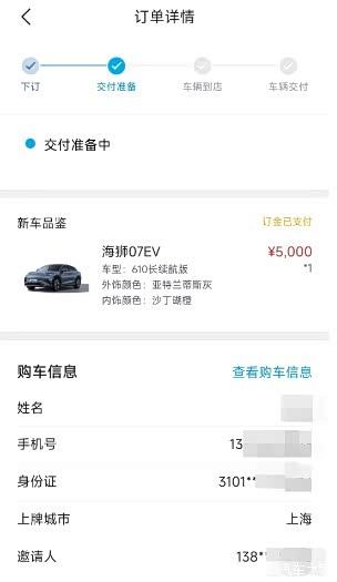 海狮07EV 的准车主,订单已经核销,目前还没有提车,实车已经试驾体验,总体感觉良好,遗憾的就是沙丁瑚橙内饰的实车目前还没有看到,内心还是想从原车压抑的黑色内饰转换到明亮大气的橙色内饰。下图APP订单验证