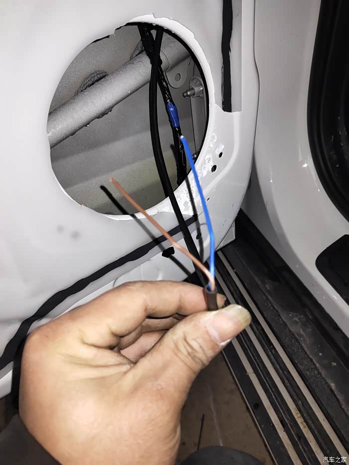 左后门从地板直接放过来 到柱子里穿过去,我用的是 监控用的电源线带护套不怕 磨穿短路