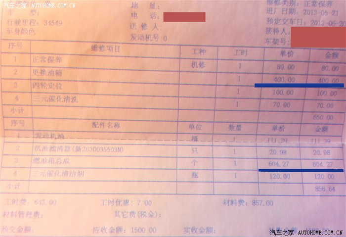 最后晒一下费用,特别注明其它正常保养不属于更换油箱费用,更换油箱及工时费约600+400=1000元。