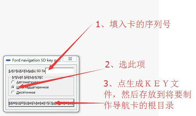 运行里面的GenFordKey.exe,在弹出的界面空格地方填入上面读取到的 SD卡的 序列号,然后再选下面选第二项,最后点最下面生成SD KEY文件(文件名是:SDcard.key ),把这个文件拷贝到SD卡根目录,再拷贝地图文件就可以插图SYNC2中使用了。 具体如下图: