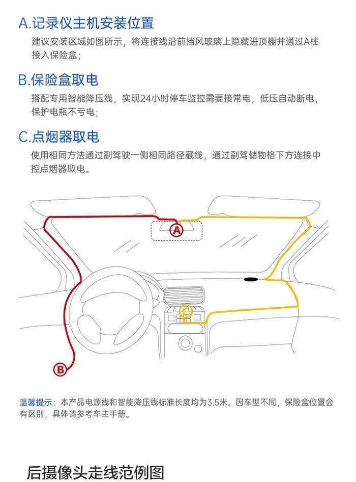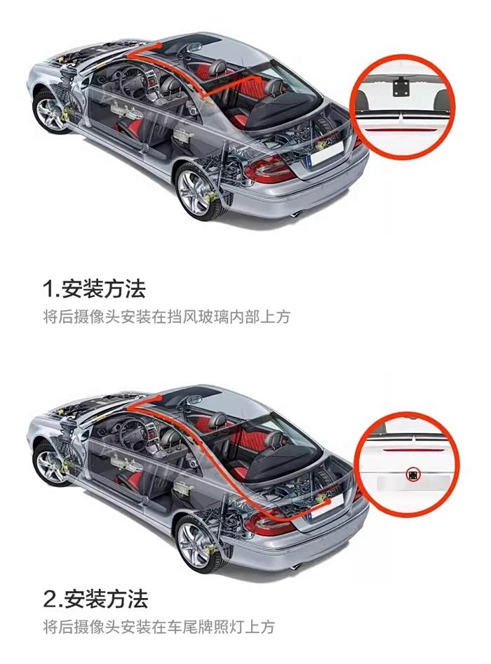 第一步:先搞清楚如何安装。特别是走线。店家也给了安装说明,行车记录仪就是安装在原车后视镜的位置,摄像头的位置车后的比较麻烦,需要安装在后备箱盖子上。不过安装说明操作也不难。