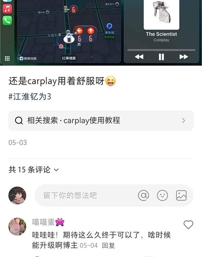 通过carlife手机投屏,可以有效解决,1车机定位芯片质量差、经常定位不准确的问题;2咱们车机娱乐流量马上2年到期的问题;3实现真的车道级导航,今天早上亲测,变换车道时,导航的车道也跟着变,大概延时1-2秒。