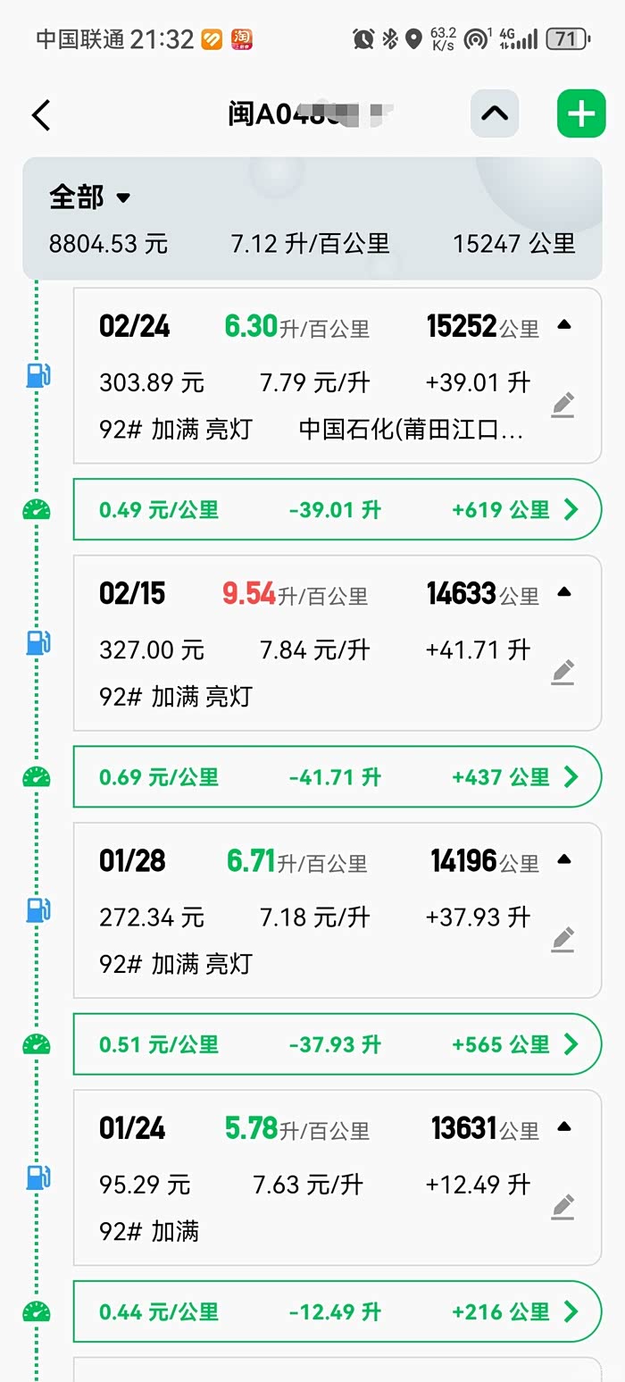 油耗这块,目前总平均是7.1L/百公里,这个车跑高速油耗比较低,开空调的情况下,速度在110-120码时,油耗在6.4L/公里,国道上行驶,如果不堵车,速度能保持在60-70码,油耗在4.7-5.5范围,在市区跑,油耗在7-12范围,如果是2公里内的短途,油耗就比较高了,会在12-22个范围。以下图片,是平常油耗。