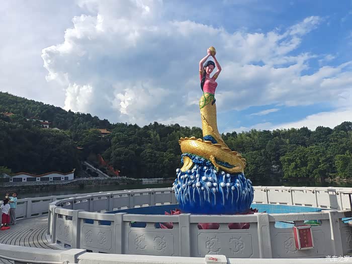 初入秋,太阳不那么热辣,知了不那么叫得强劲,早晚的呼吸里能品出秋的凉意。入秋后每一天的天空像是打了个瞌睡又突然睁了开蔚蓝的眼睛般,蓝得那样深邃、宁静、悠远,装靓蓝天的高层卷积云,如盛开的白荷,静静地泊在一碧如洗的湖面般的远空。又到了周末时间,开着我家的蓝胖子微蓝6,这次是去探访郴州龙女温泉景区的龙女寺。