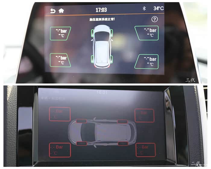 胎压监测方面,三代改为了竖型显示,这样比二代的横向显示更直观一些