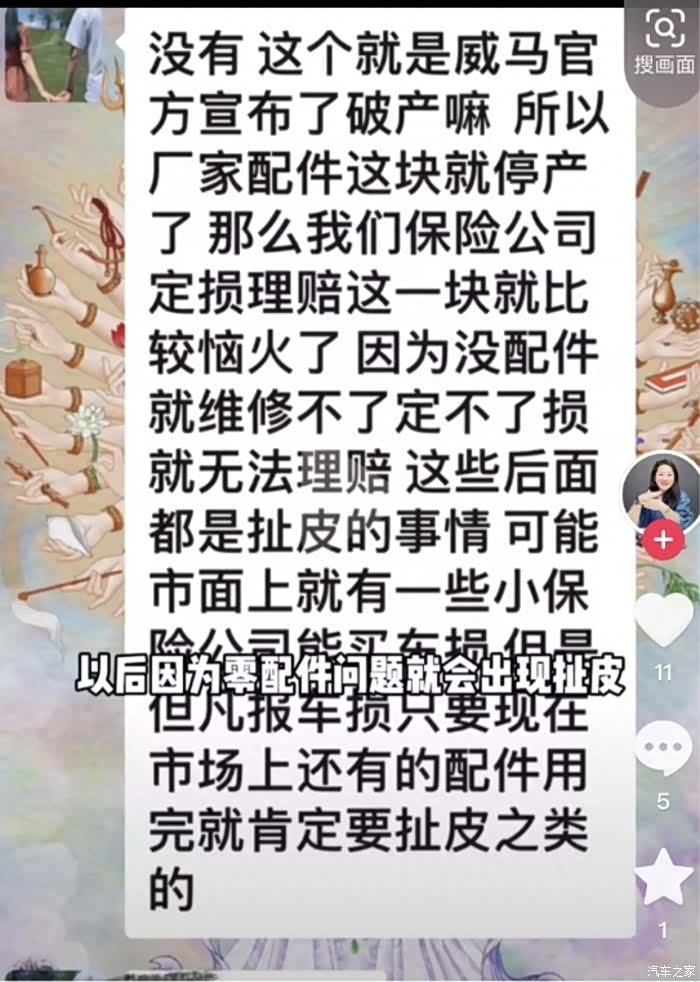 近日,一位威马汽车车主发布视频爆料称,她接到保险公司销售人员的通知,由于威马汽车停产,零部件供应容易出现问题,所有车险公司不再承保威马汽车的车损险。
