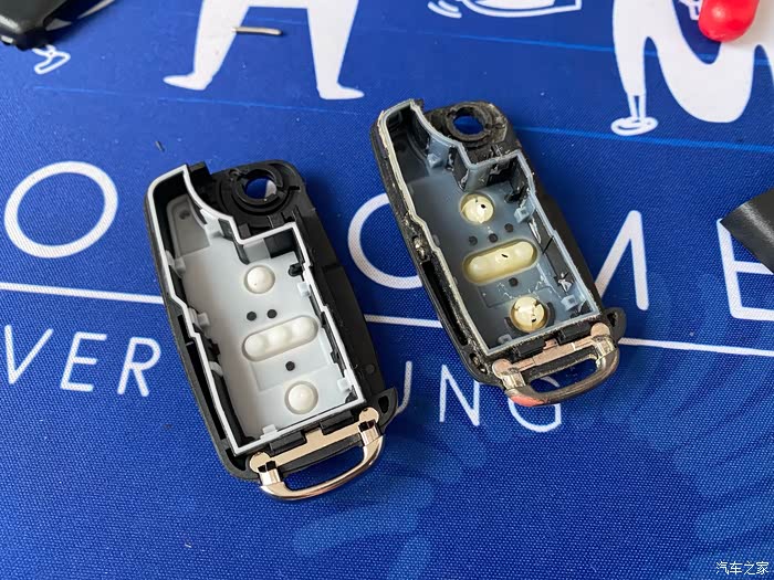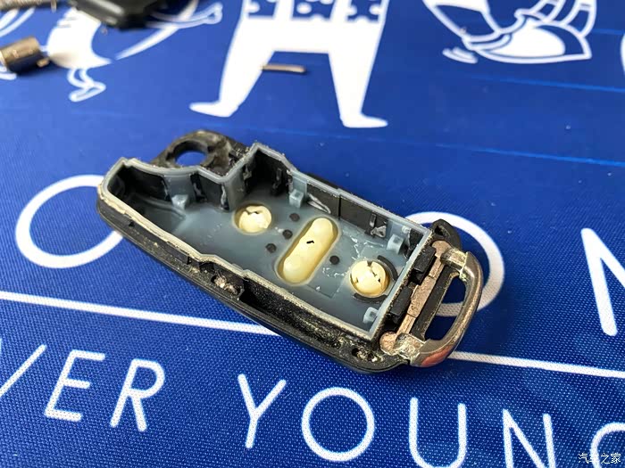 这时我们拿到原车的钥匙壳,可以很清楚的看到原车钥匙按键底部的胶壳已完全破裂,内部按键也发生了位移,这就是为什么从外部看按键凹陷且不灵敏的原因!
