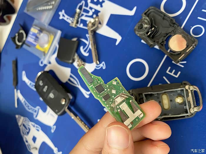 将钥匙分成两块后,这把钥匙壳基本也就报废了!这时我们可以看到一整块的电路板以及一块纽扣电池~