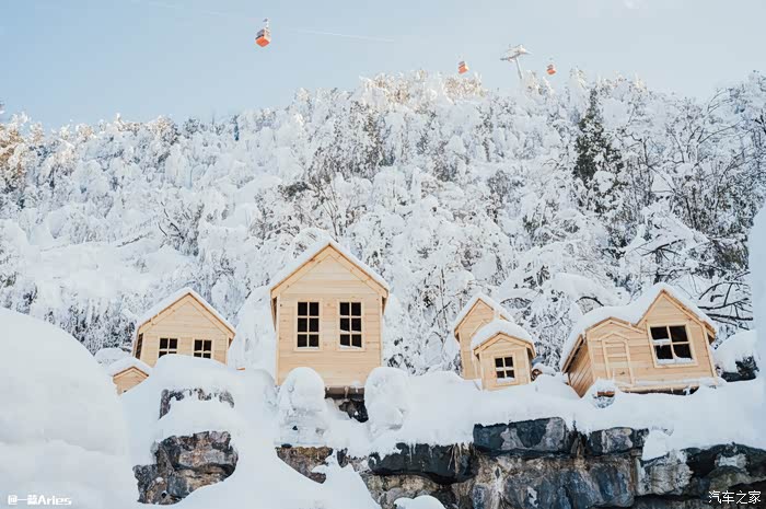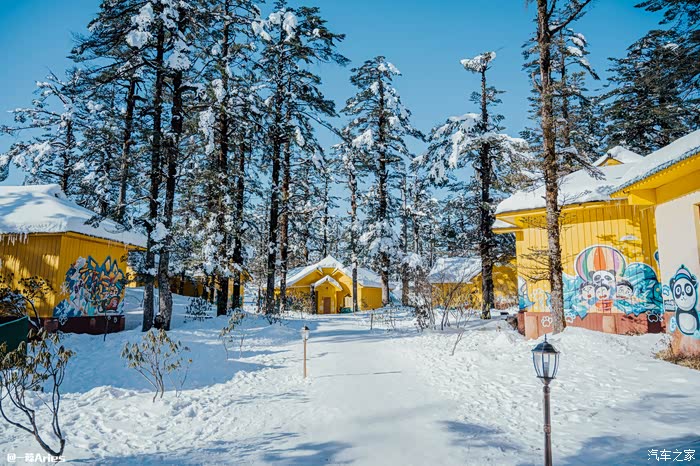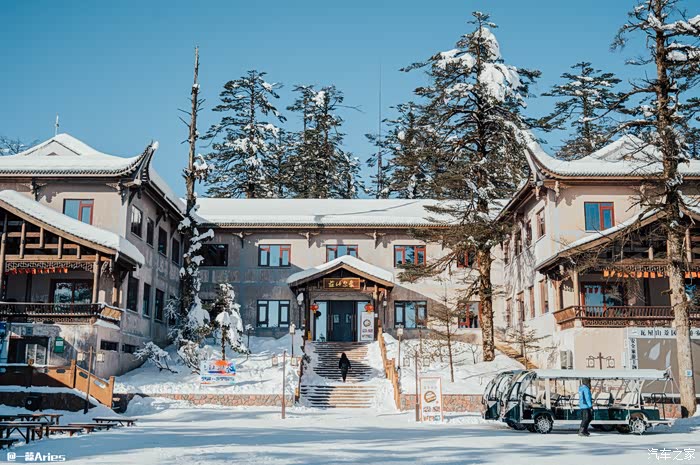 第三站是电瓶车的终点象尔山庄,洁白的雪落满山间、屋舍、道路,树梢和屋顶,全都堆满了纯净的雪棉花,闪着晶莹耀眼的光芒。