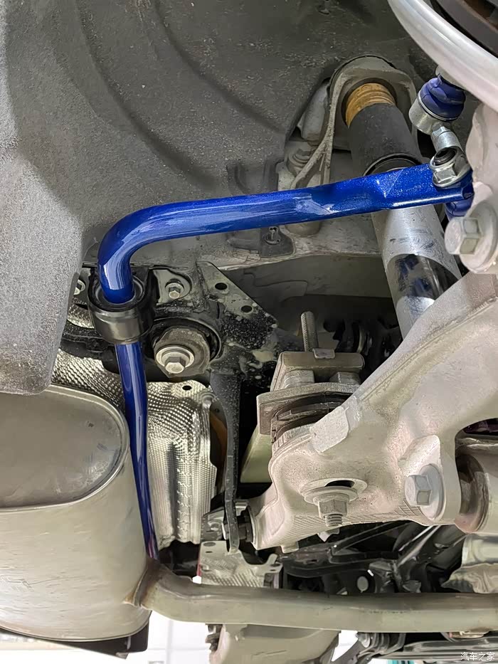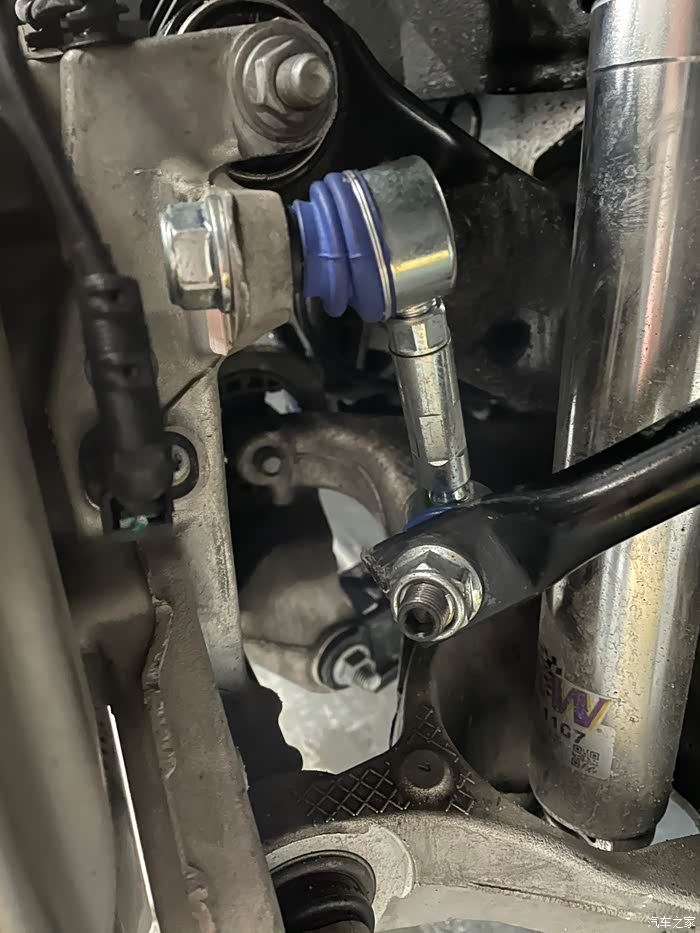装完绞牙避震,角度可调防倾杆连杆(李子串)也必须装上防止前轮抖动。下面图中角度保持90度即可。避震都换了,顺便再把防倾杆也换了吧。HR防倾杆一抹蓝色很是亮眼,比原车粗了不少,侧倾控制再次得到提升。