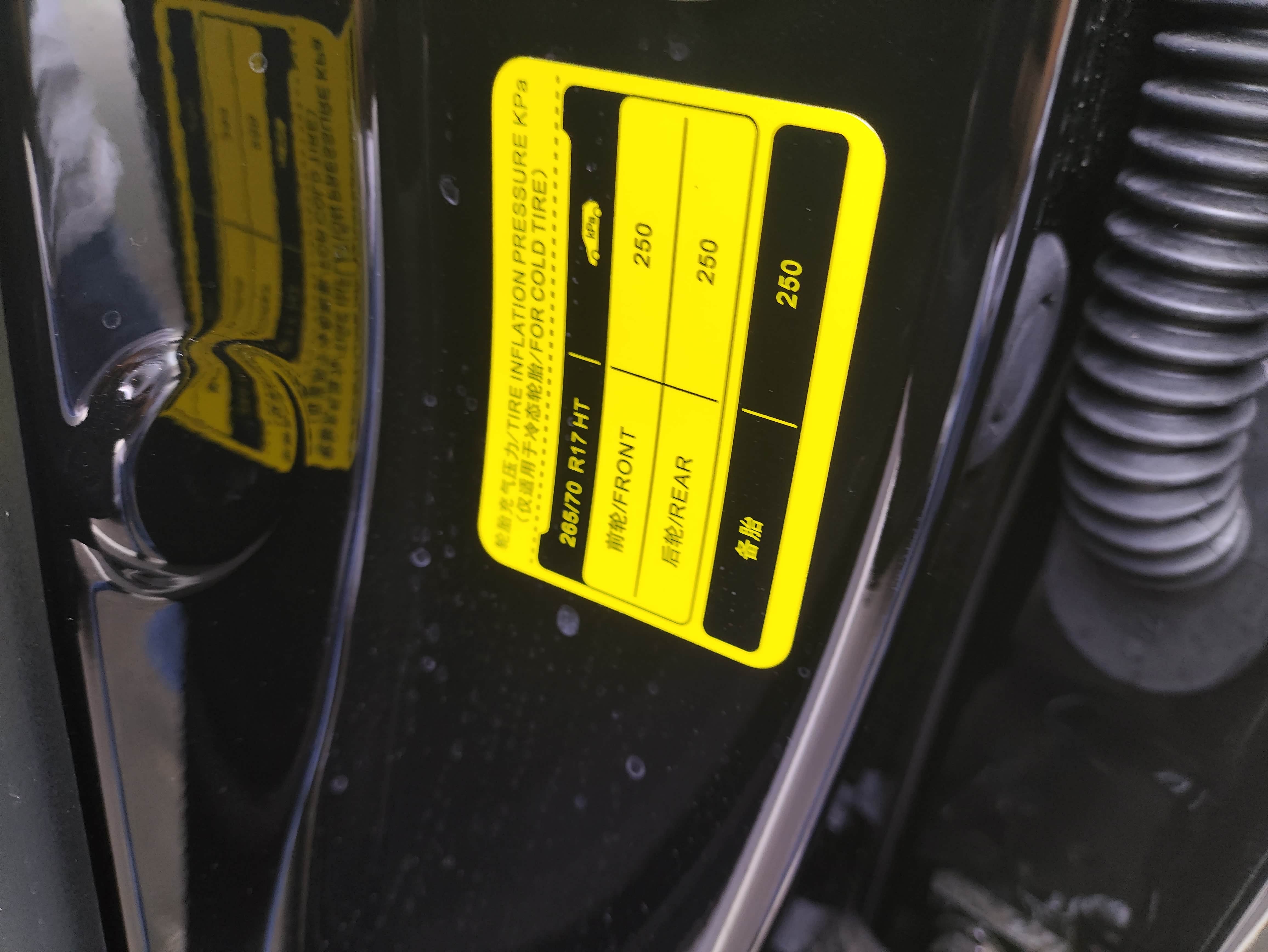 最后就是胎压会随着天气变冷会减少需要及时补气,如果不知道胎压多少适合可以打开主驾驶车门会发现B柱下方贴有胎压标识。