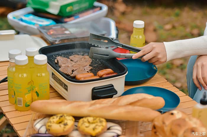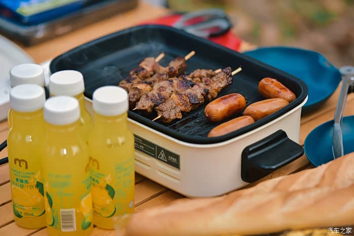 接上了电烤炉,开始享受现代露营的便利与舒适。随着电烤炉的加热烤肉发出了滋啦的煎肉声,露营地的气氛逐渐热烈起来。我们围坐在电烤炉旁,品尝着美味的烤肉,享受着难得的休闲时光。