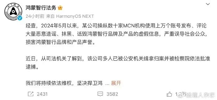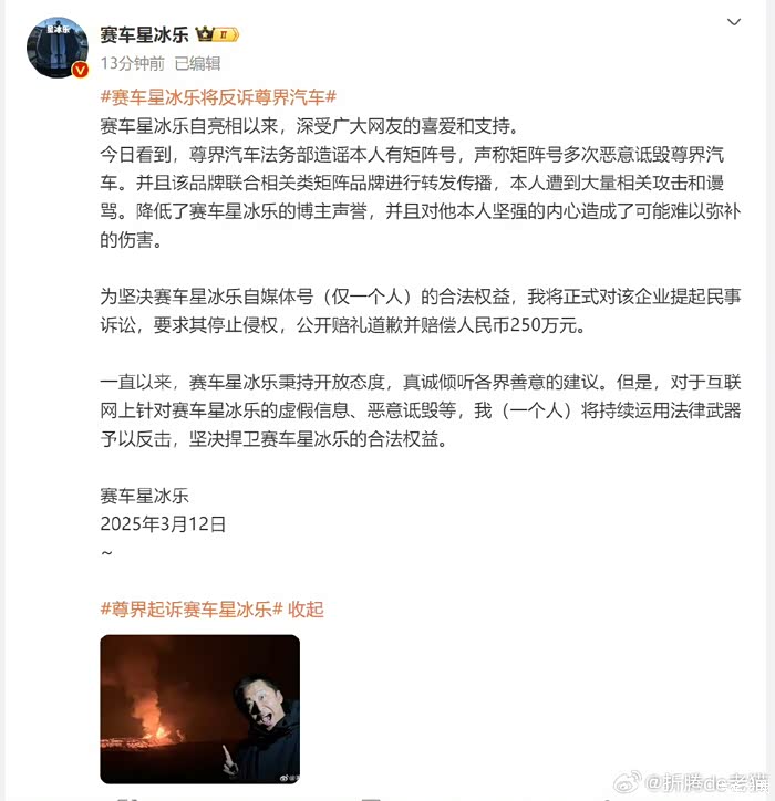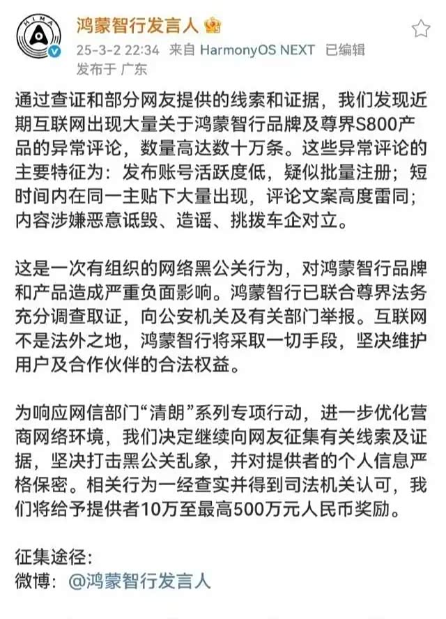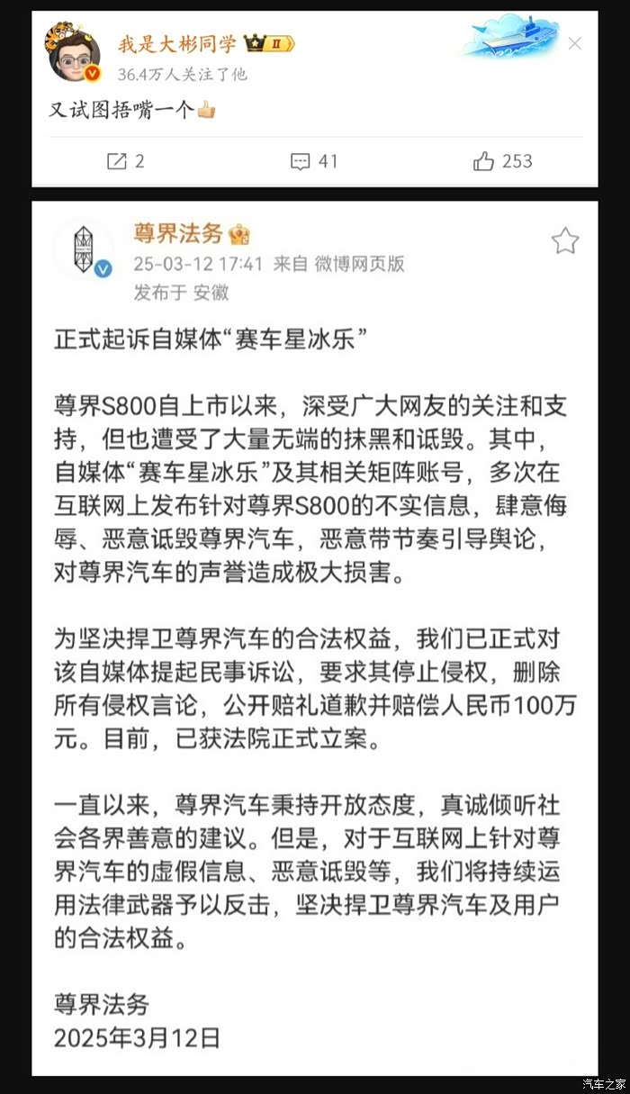 这几天鸿蒙智行法务动作频出,对外宣称有大规模的组织黑公关攻击尊界,到又宣布某公司操纵数十家MCN机构发虚假消息多人到案就不说了。后面鸿蒙智行法务和尊界法务连续两天发起对自媒体大V大斌和星冰乐的诉讼,更是引起很大热议。