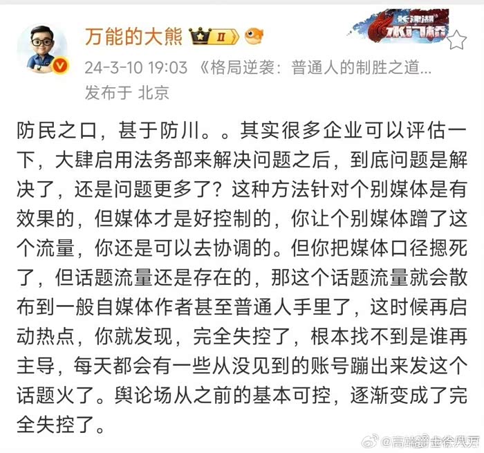 虽然很多华为粉丝觉得大快人心,但是这个事就像利剑会有两面性。就像大熊说的那样,防民之口甚于防川,这个度确实不好把握。大肆使用法务解决问题,看似把问题解决了,但其实到最后媒体的口被封住,但是普通人的口你封不住,到时候变成星星之火遍野,反而对品牌更不利!