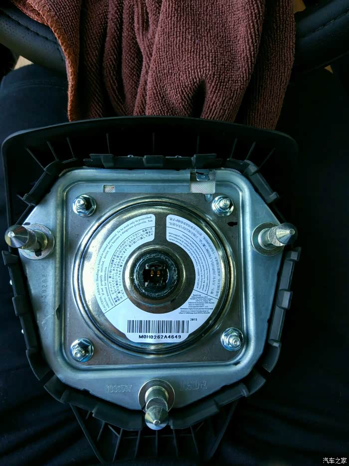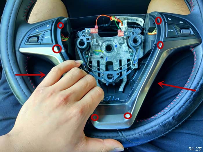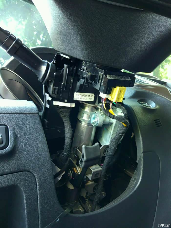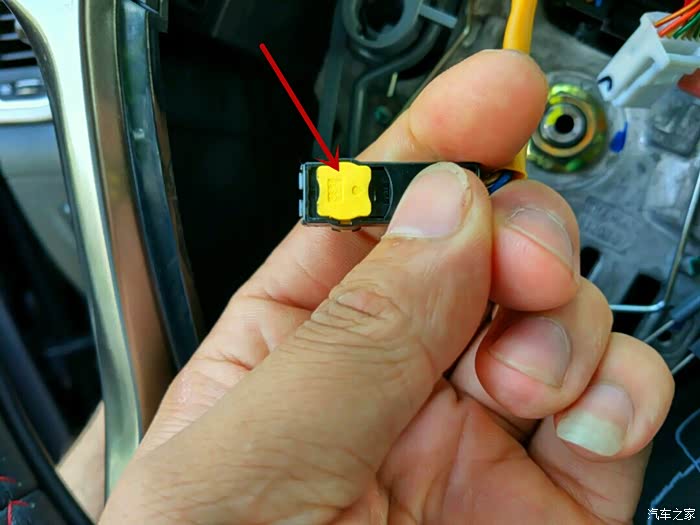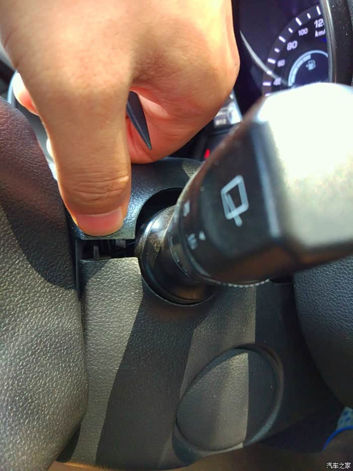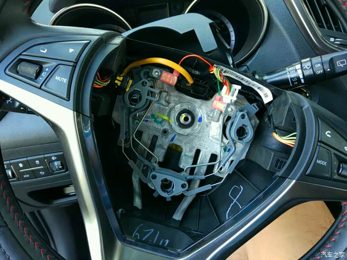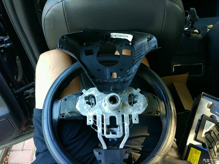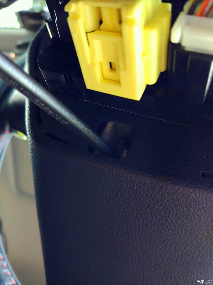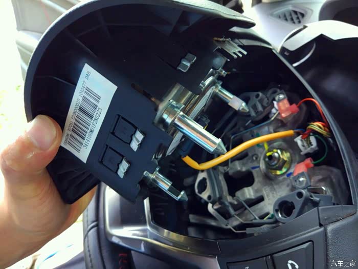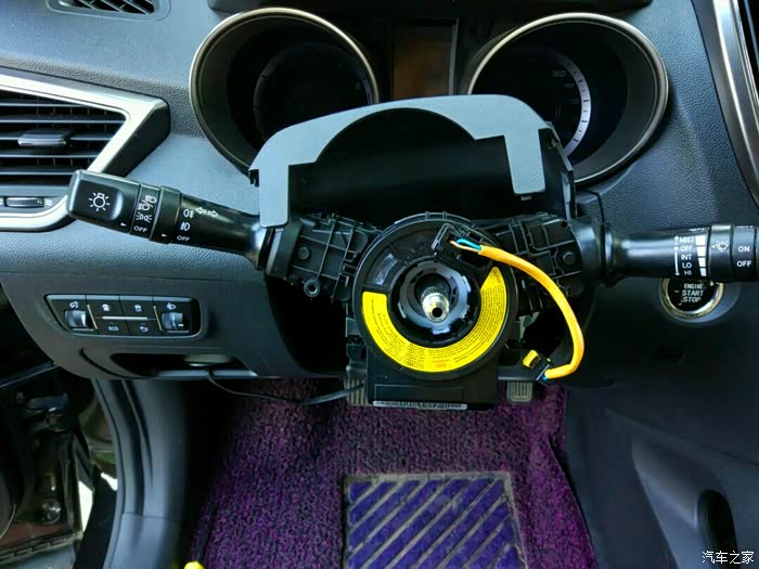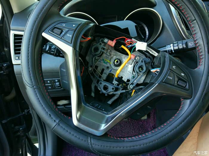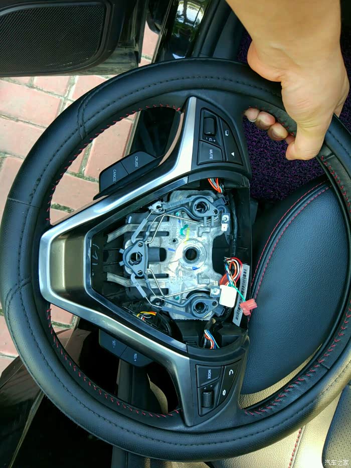 5、拆掉原车配件更换自动款的定速按键,当然土豪可以直接换方向盘总成。总成装好后装车,接上电瓶负极。