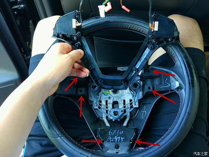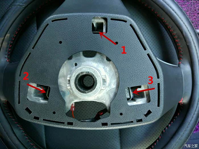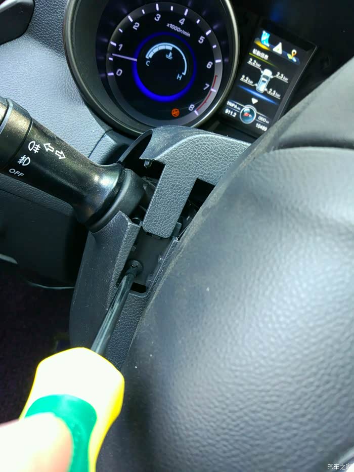 然后就是拆下盖,有三颗螺丝分别在方向盘左右和最下面。首先方向盘打90度就能看见螺丝了,记住这个步骤实在点火状态。