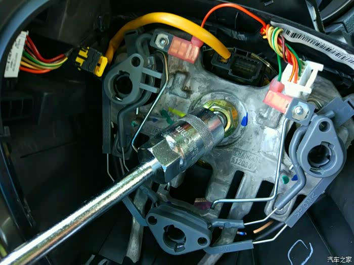 用19#套筒扳手拆掉这个螺丝就可以拔掉整个方向盘了。真的折腾死我了,继续摸索