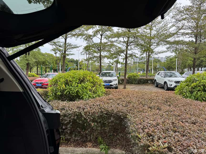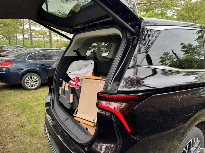 停好车,先去后备箱收拾东西,电动尾门可以调高度,我妈个子不高,特意设了她够得到的挡位。尾箱空间挺大,这次带了把家里露营的东西全都带上了,稍微规整下,第三排不用动就装好了。