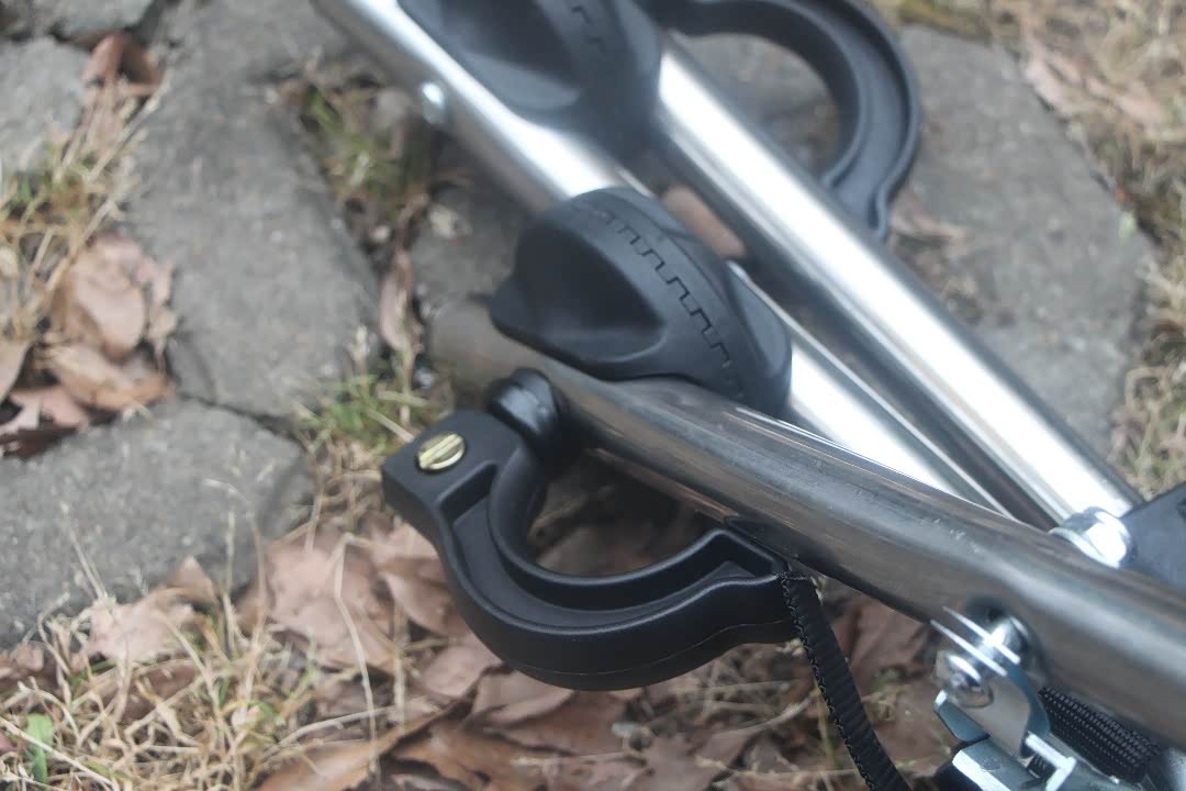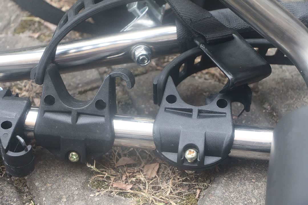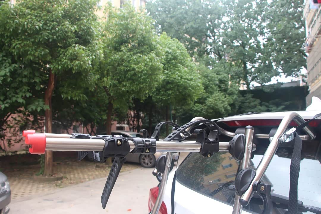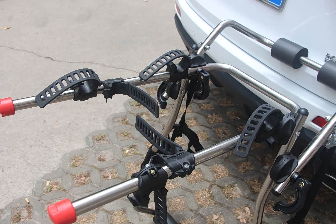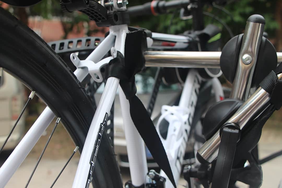 安装的自行车架是六点位置挂钩,上面两个,左右各一个,下面两个,这样全方位固定住。安装好以后必须检查一下,是否挡住车牌!这一点尤为重要,如果挡住车牌,交警拦住可是不轻的处理。