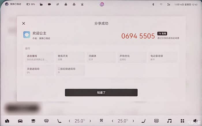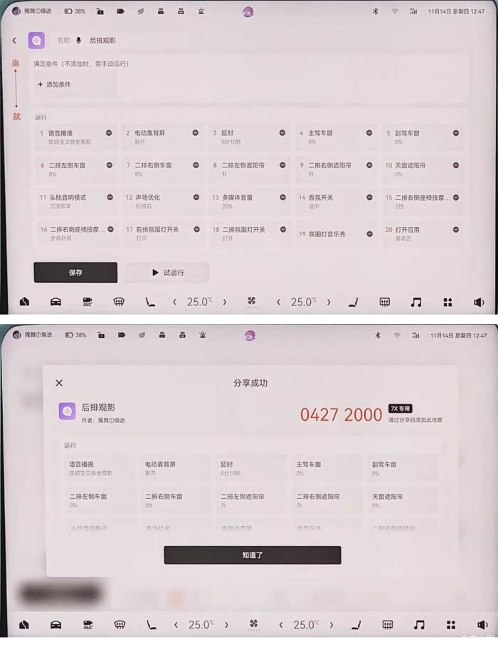手动场景,加入快捷栏。当孩子右后观影时,打开香氛、摄像头、后排屏幕及遮阳帘、关闭天窗遮阳帘、进行声场优化。