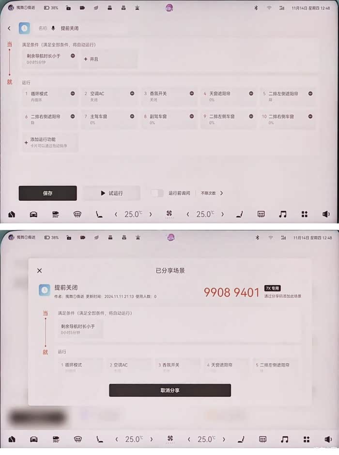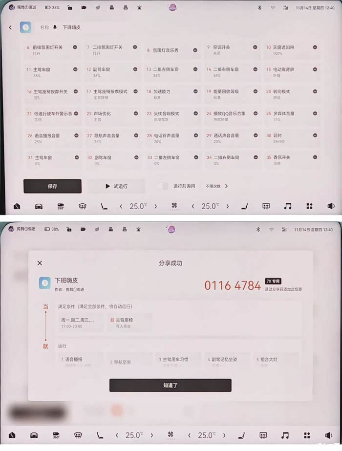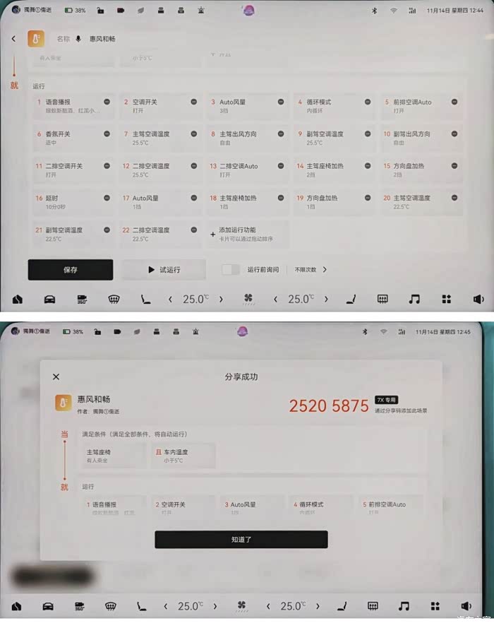 更新:上述三个场景的开窗通风时间(延时)后来改为3分钟再关窗了。当下冬季,增加了方向盘加热和座椅加热功能。