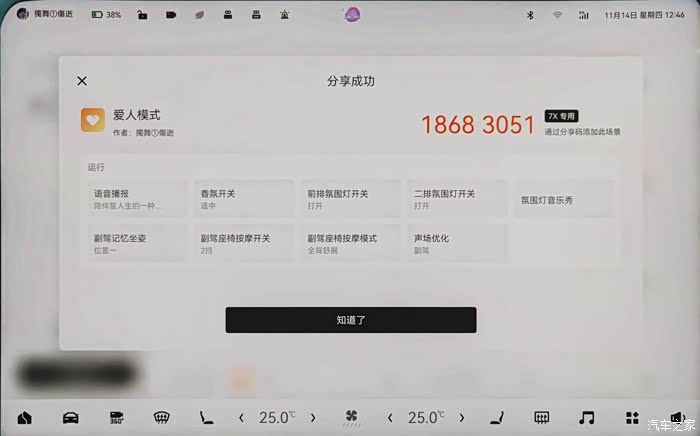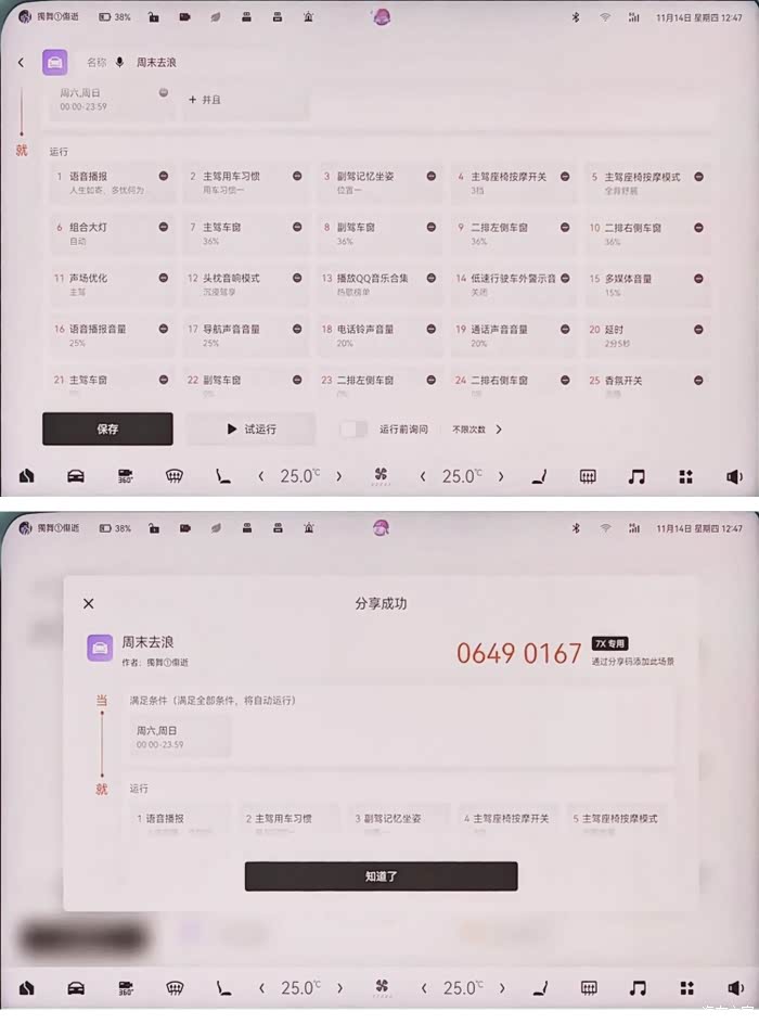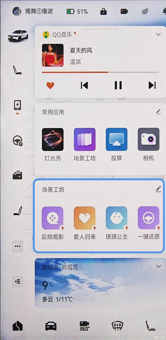 这是个手动触发场景。当伴侣坐副驾时,打开香氛、按摩、氛围灯,并进行声场优化。我把它放入中控主页左侧快捷栏了,位于一级菜单,便于手动操作。