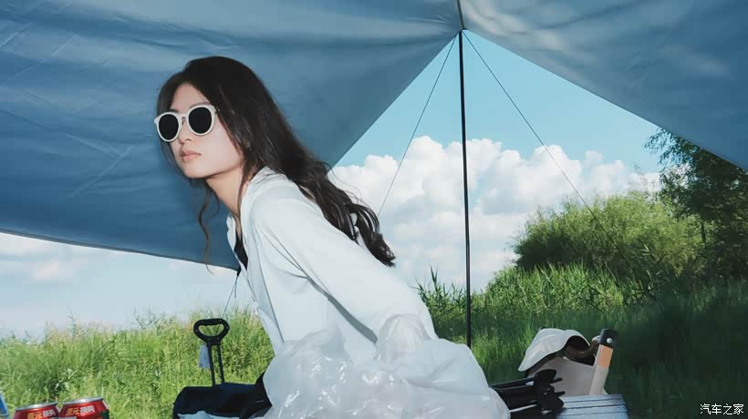 趁着表妹换衣服,我把露营的天幕和小桌子都搭建了起来,主打一个先吃饱了在干活!上午太阳晒起来,我们躲进帐篷里吃东西。表妹突然指着远处:"你看那家人带了吊床!早知道我也带一个,挂在树上拍肯定好看。