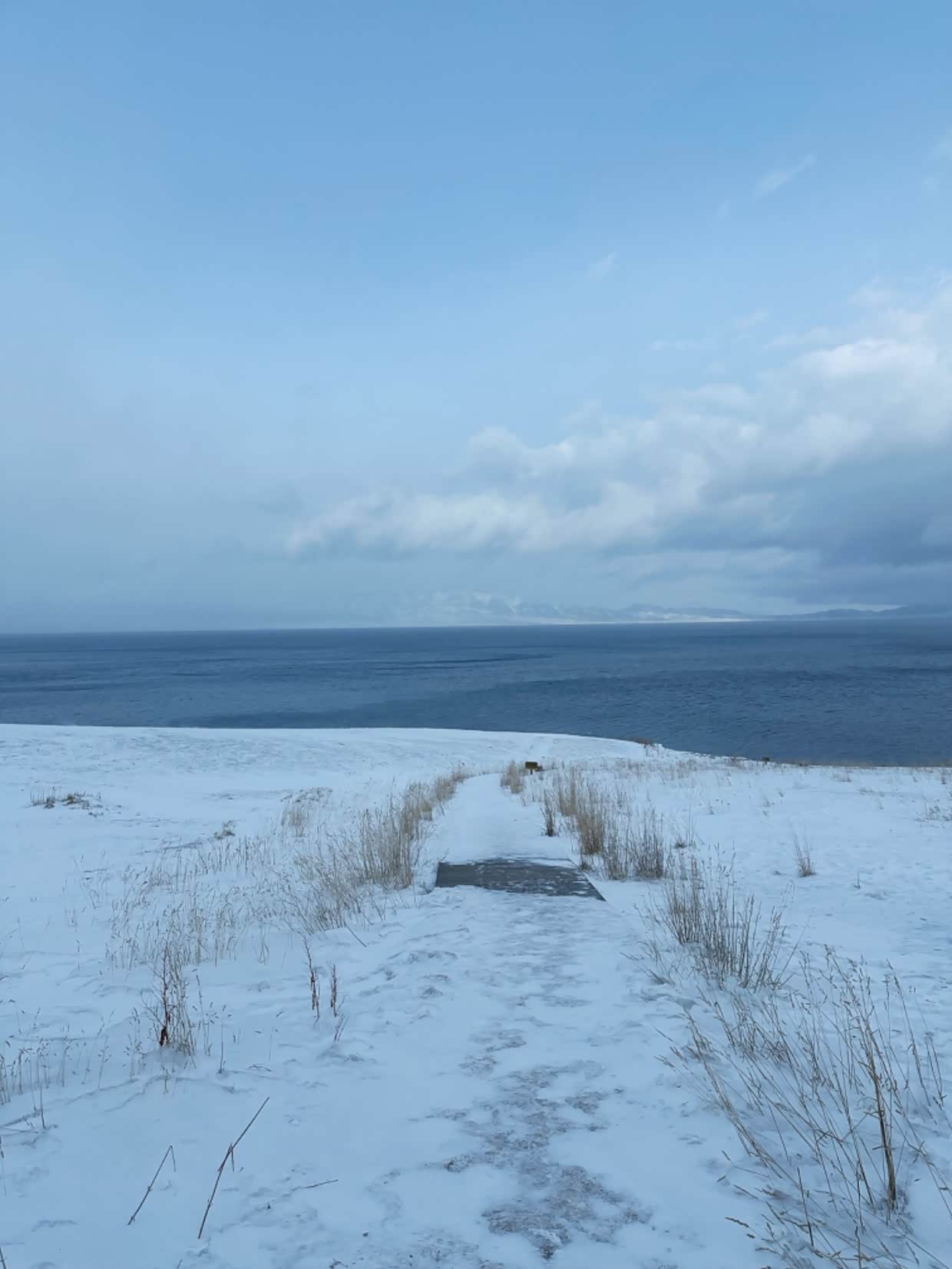 爬台阶要特别小心,木台阶上结了冰。站在最高处,视野一下子开阔了。整个赛里木湖就在眼前展开——近处是深蓝的湖水,中间是白色的湖岸线,远处是连绵的雪山。风很大,吹得脸发麻,但眼前的景色让人不想离开。