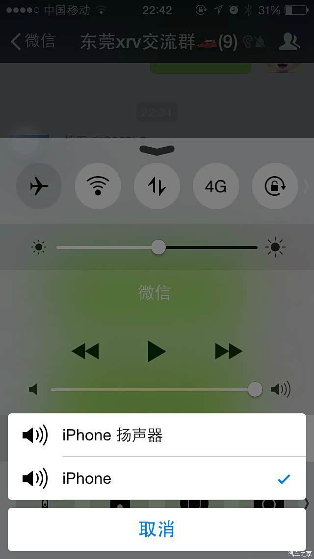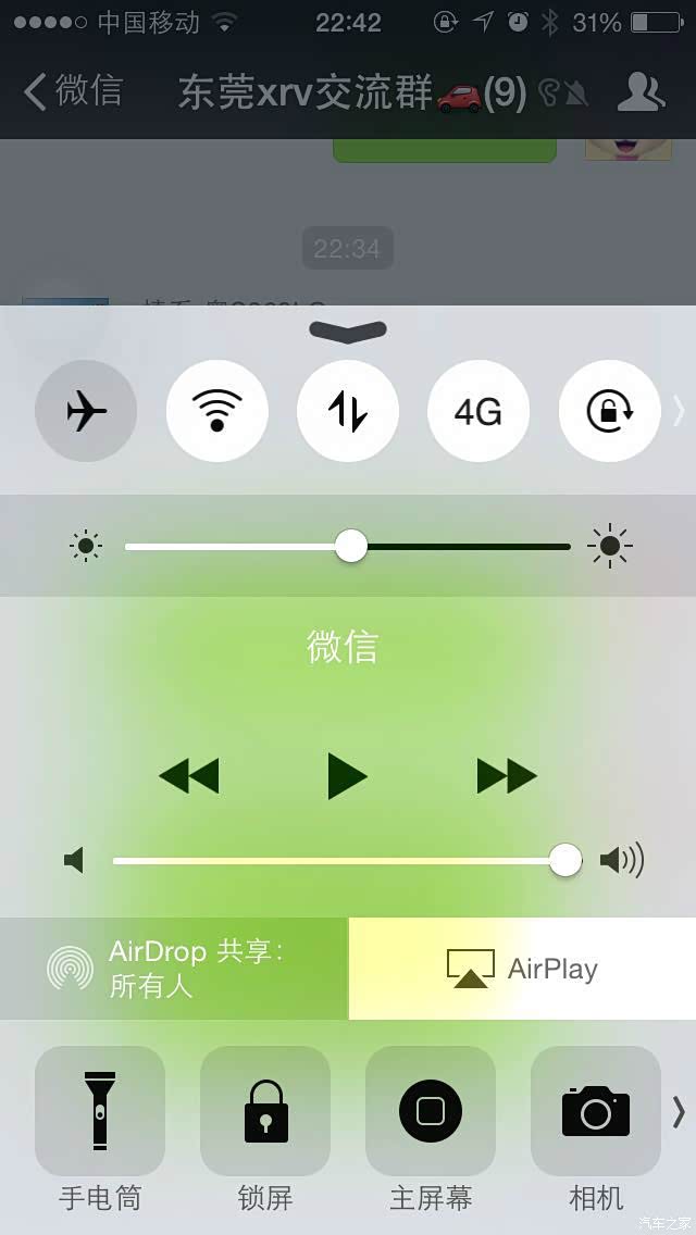 只要你的手机苹果有连接自己的车上,只要有人发微信过来你就会出现上图这样,没有声音,秒数一直在跳,但是又没有声音,歌曲也放不了,所有的按键全部都按不了,有些时候可以秒数可以达到5分钟,很讨厌,这个时候你就要这样做下图——向上扫一下苹果手机按一下AiaPlay