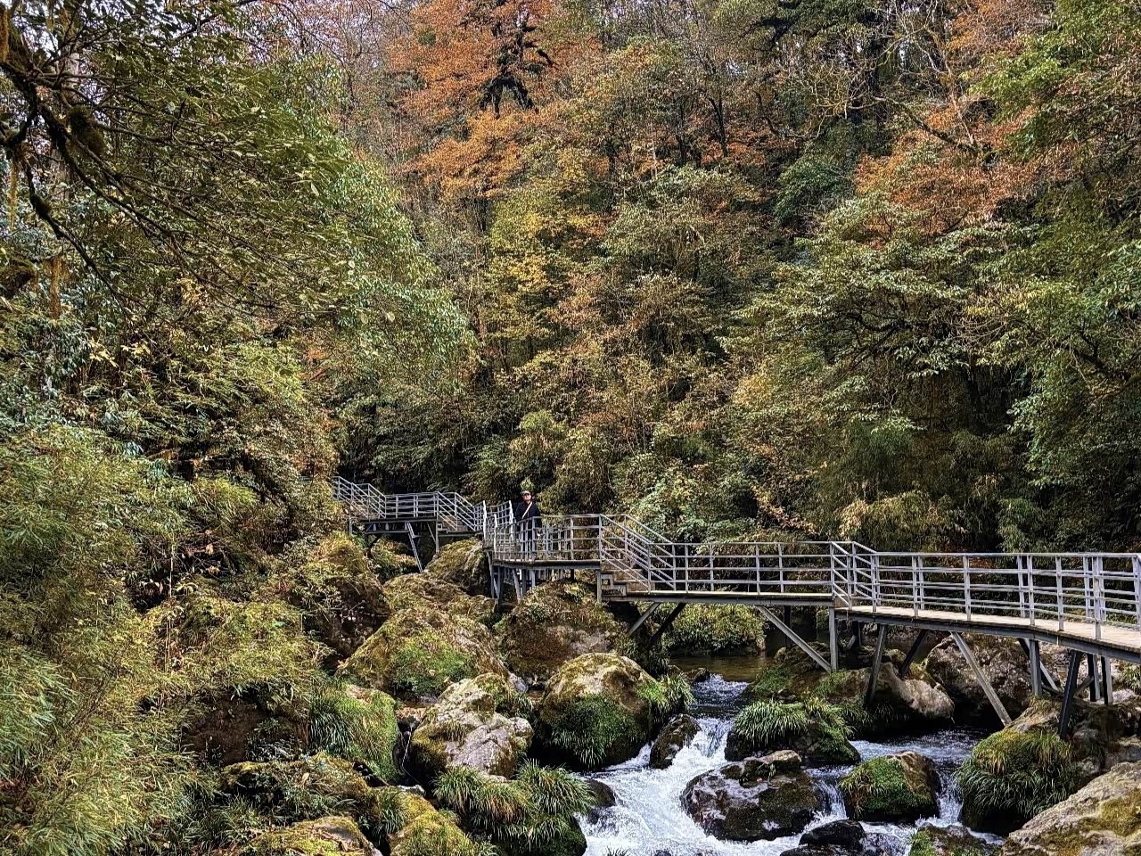 我们走的路线超舒服,从翡翠湖码头出发,依次经过龙翔瀑布、花溪流翠、杜鹃戏水、石来运转、雨花瀑布,最后到珙桐山房,一路逛下来节奏刚好,不累还能尽情赏景。路线主要是生态栈道加少量山路,走起来不费脚,沿途山谷里溪流纵横,空气清新,这几天的彩林颜色也够丰富,层次感满满,特别适合秋日徒步放松。