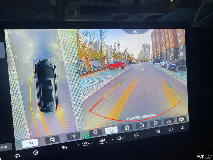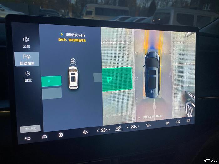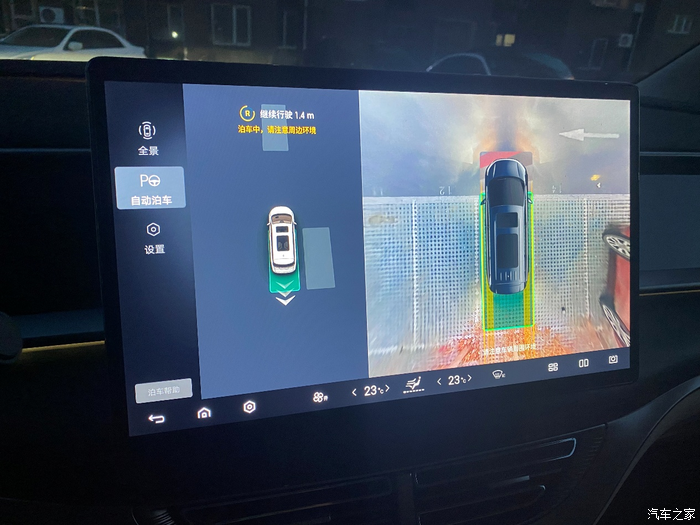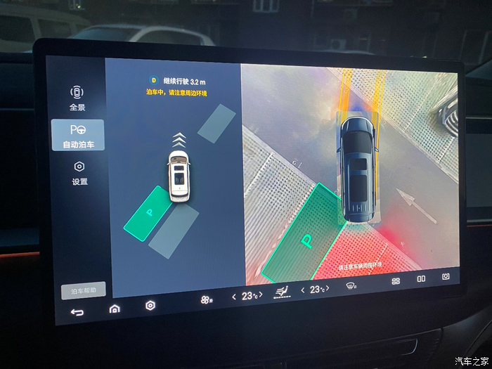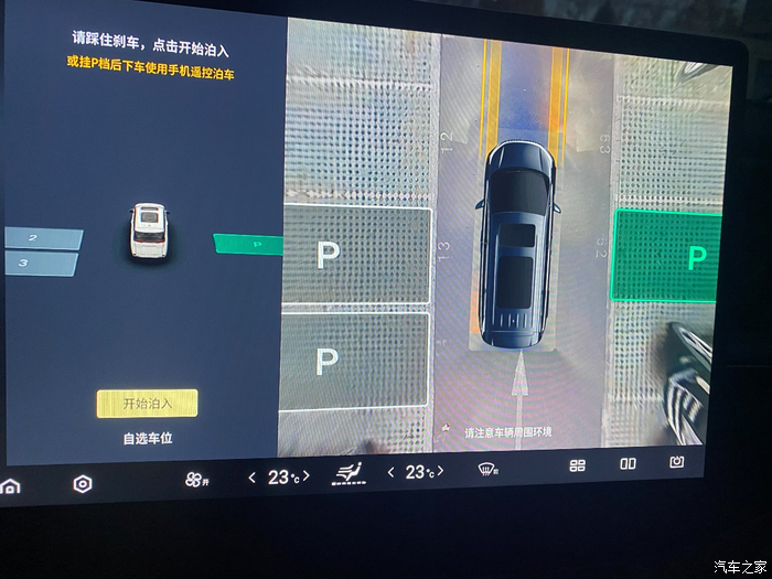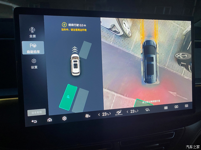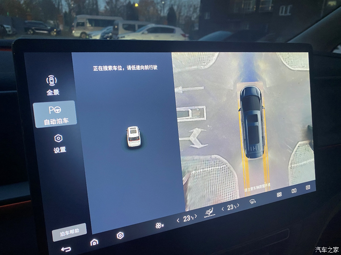 我先按下了自动泊车的按钮,如果懒得按按钮也可以用语音开启,中控屏上立刻显示出了车辆周围的环境图像,非常清晰,连地上的划线都能看得清清楚楚。系统开始搜索可用车位,我试了一下前后寻找车位,感觉前进的时候找车位的速度快一些,倒车时候不好找到车位。所以我建议,想用自动泊车的情况下,先把自己先开启自动泊车再顺着这位往前走,速度要慢一些