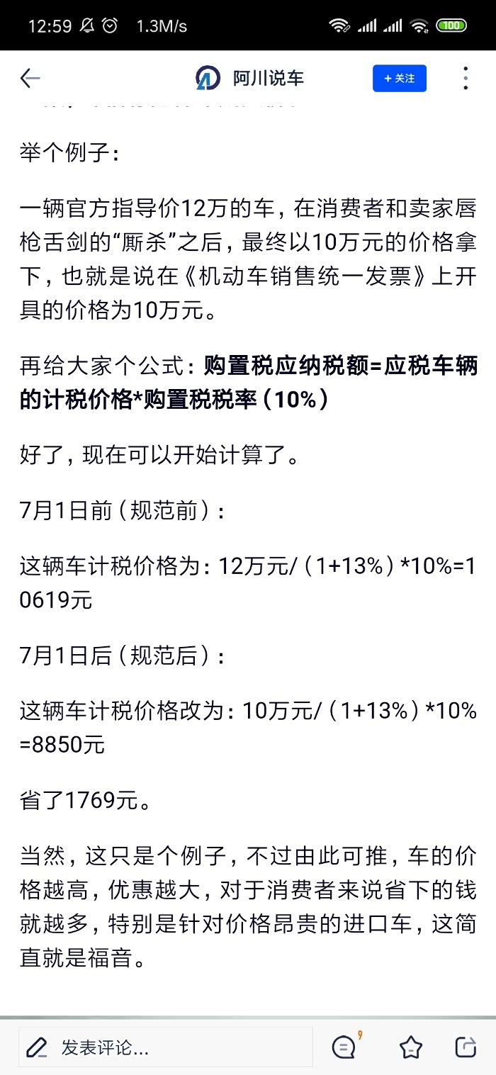 计算错误,老购置税除以了1.17就是扣除其中的增值税部分,这几年国内增值税改革,早已不是17%的增值税了,所以不是除以1.17。第二是新购置税的计算方法依然错误,新购置税还是要扣除增值税部分在乘以10%,所以上面的计算完全是误导。而实际是7月1日以后不是增加税额,对于优惠幅度大的车型是减少购置税。看看下面的采访就知道了: 据北京国家会计学院财税与应用研究所所长李旭红介绍,《中华人民共和国车辆购置税法》规定:“纳税人购买自用应税车辆的计税价格,为纳税人实际支付给销售者的全部价款,不包括增值税税款。”因为《车辆购置税法》是按照税制平移思路,保持现...