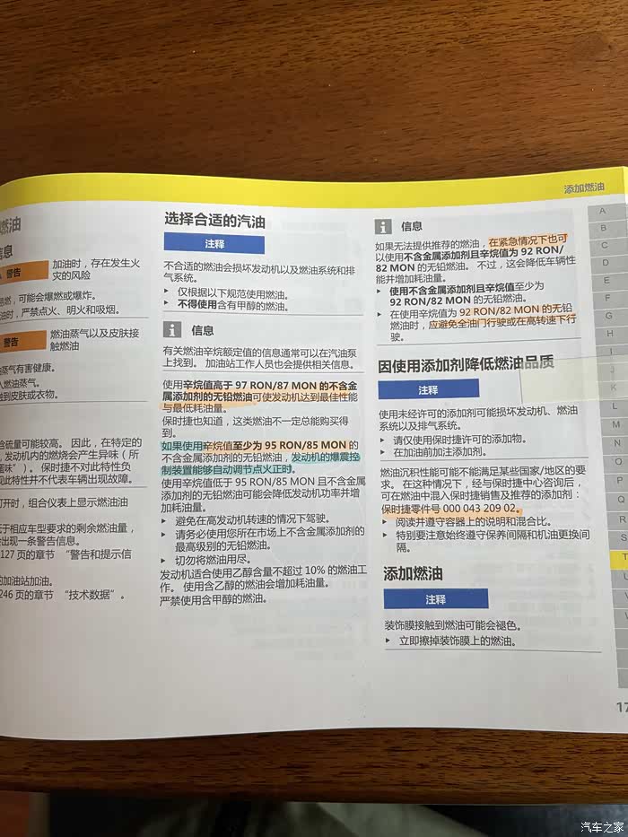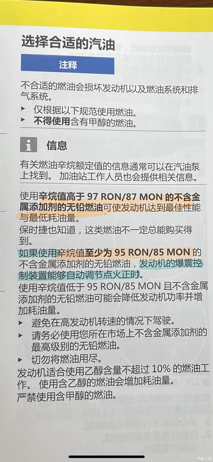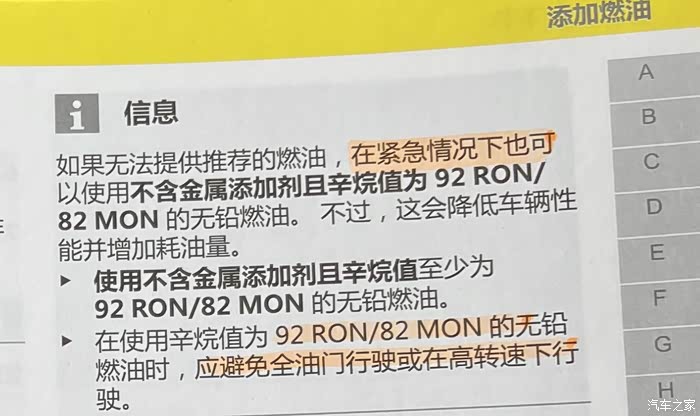 其实车子的手册里有非常详细的说明,下图是国六2.0T手册里的“权威”答案,油箱盖上也有98/95的提示,那么到底加几号的油合适?
