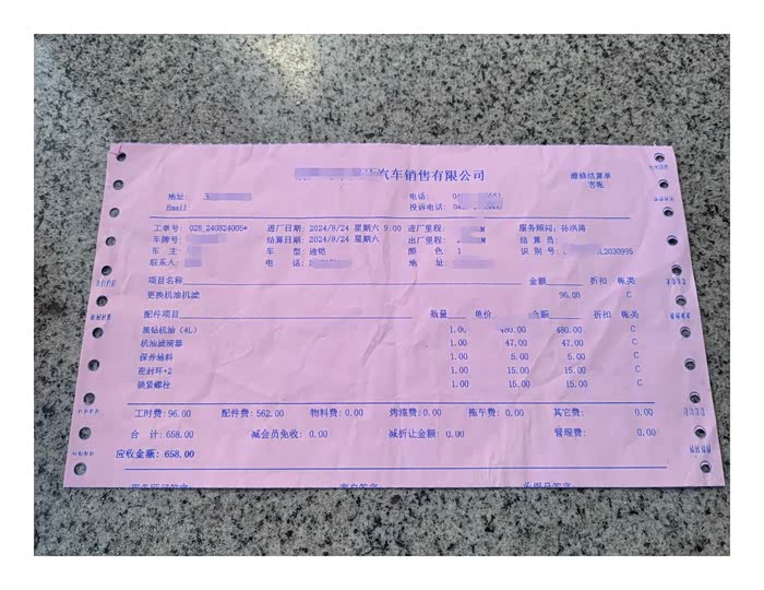 本次的维修清单已经打印出来了,详细的价格也历历在目,黑钻的全合成机油,加上原厂的机油滤芯,还有更换的螺丝,空调滤芯和空气滤芯简单的拆卸清理,没有进行更换,总体上感觉价格适中,维修保养加上检查车辆状态,还是挺值得的。