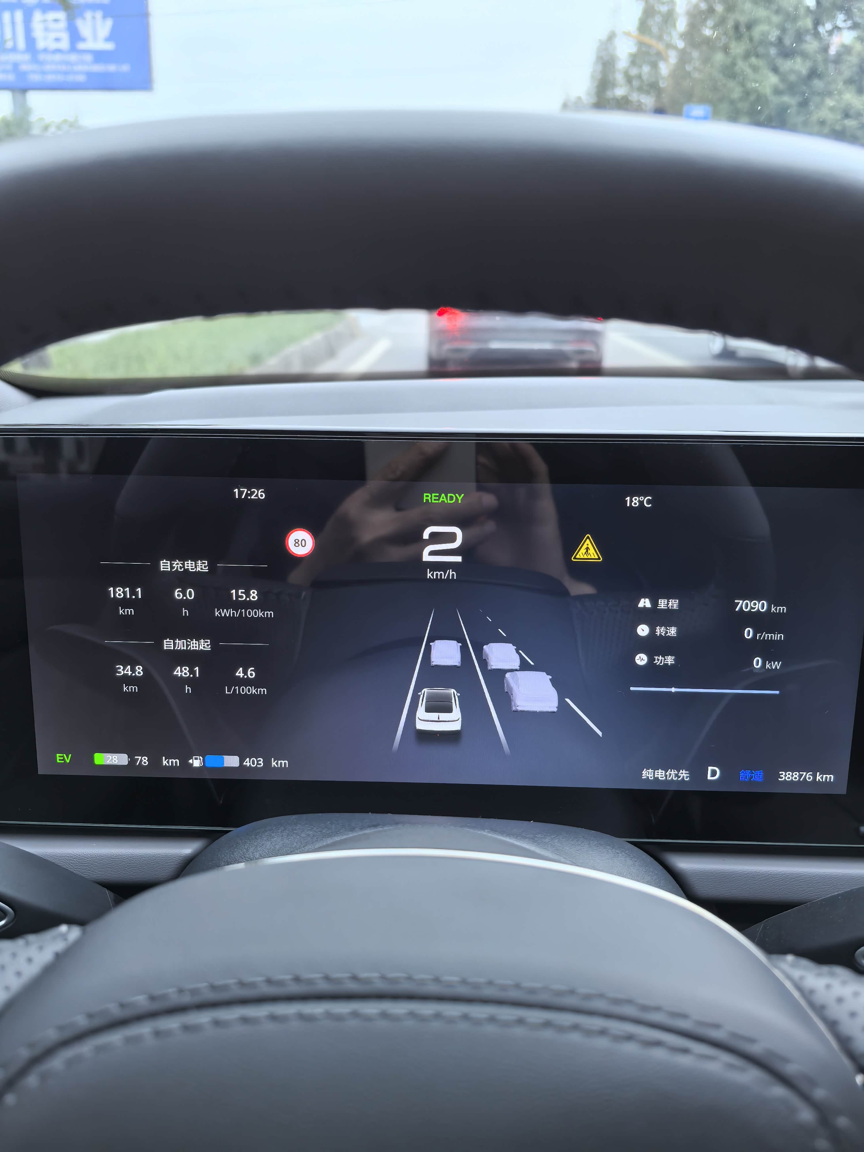 先说说纯电续航,这台车搭载的43度大电池,官方标注的纯电续航很实在,实际使用中虽然会受温度影响,但折扣不算夸张。春秋季温度适宜时,市区通勤电耗大概16.5kWh/100km,满电状态下跑200公里完全没问题;夏天开空调制冷,电耗会涨到18kWh/100km左右,冬天开暖风则会升到20kWh/100km,纯电续航会缩减到150-180公里,但对于我的日常通勤来说完全够用。我每天往返市区和郊区,单边10公里,每天20公里的路程,一周充两次电就够了,每次快充40分钟左右就能从30%充到90%,完全不耽误事。